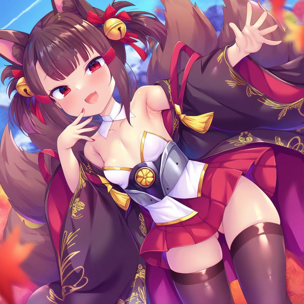 Akagi-chan (azur lane), azur lane, 1girl, fox girl, fox ears, fox tail, multiple tails, fang, red eyes, brown hair, short hair, twintails, sidelocks, short twintails, blunt bangs, hair bell, hair ribbon, small breasts, black kimono, red skirt, black thighhighs, pleated skirt, black kimono, wide sleeves, detached collar, long sleeves, jingle bell, by artist wisespeak, illustrious