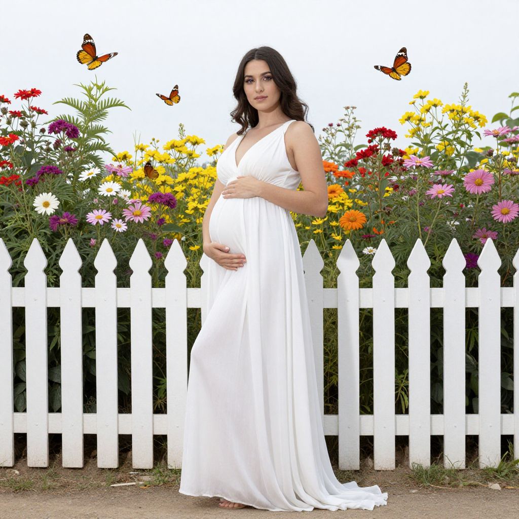 Photograph of a pregnant woman with light olive skin and dark brown, wavy hair standing in front of a white picket fence. She wears a sleeveless, white, V-neck, flowing maternity gown. Her hands rest gently on her baby bump. Behind her, a vibrant garden of red, yellow, and pink flowers with green foliage. Two orange and black butterflies flutter in the air above. The background is bright and clear, emphasizing the colorful flowers and white fence. The woman stands on a dirt pathway, smiling softly. The overall scene is cheerful and serene.