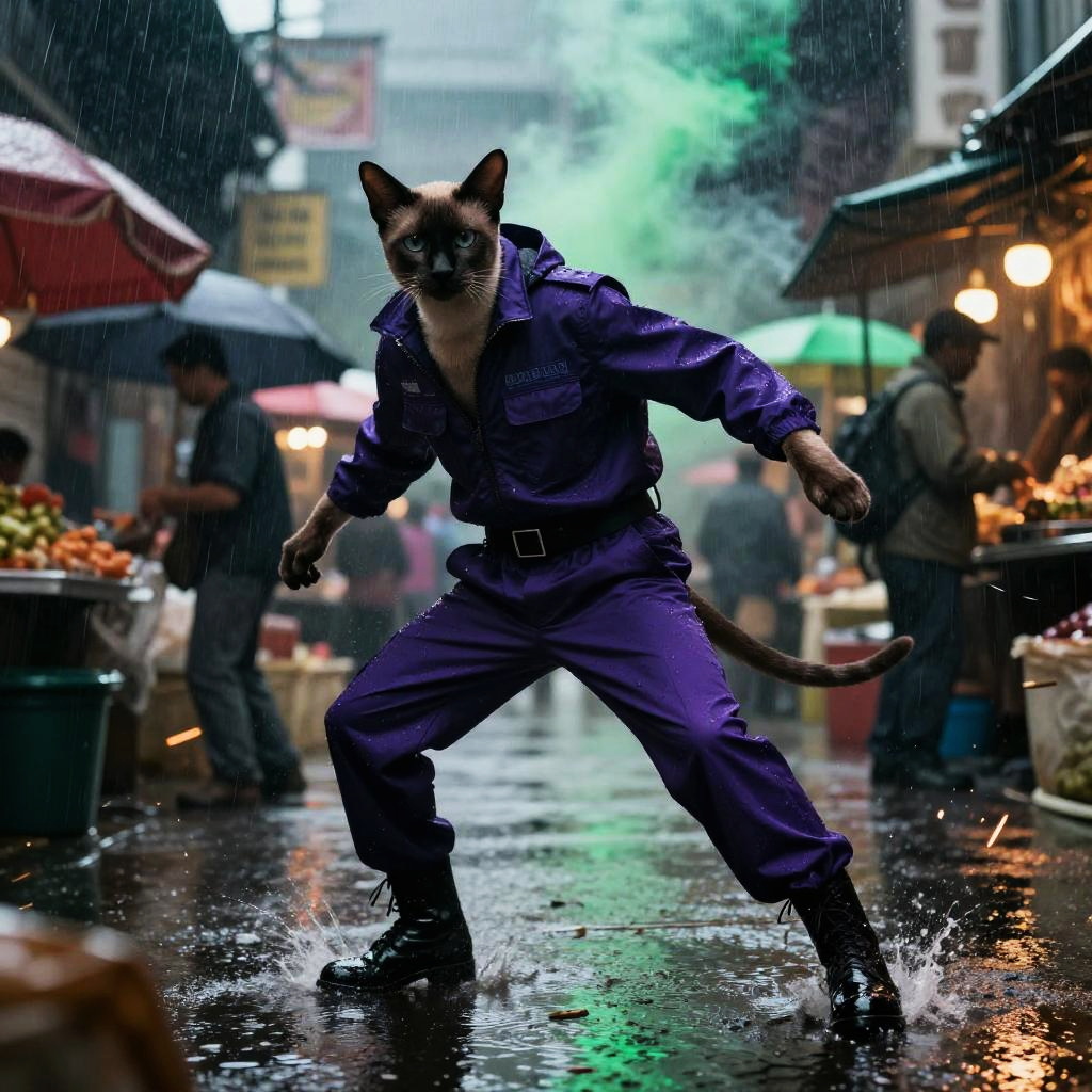 (full body) slender charcoal Burmese cat, undercover informant disguised in sleek street wear, in crowded market street drenched by nighttime rain, deep purple, emerald green, and charcoal predominate, hyper-detailing, hyper-realism, tack sharp, cinematic splash screen energy, action-packed composition, dynamic pose, rain and sparks, smoke plumes, glossy reflections, dramatic rim light, volumetric fog, motion blur trails, embers, HDR, film grain, photoreal lighting, rich textures, epic mood