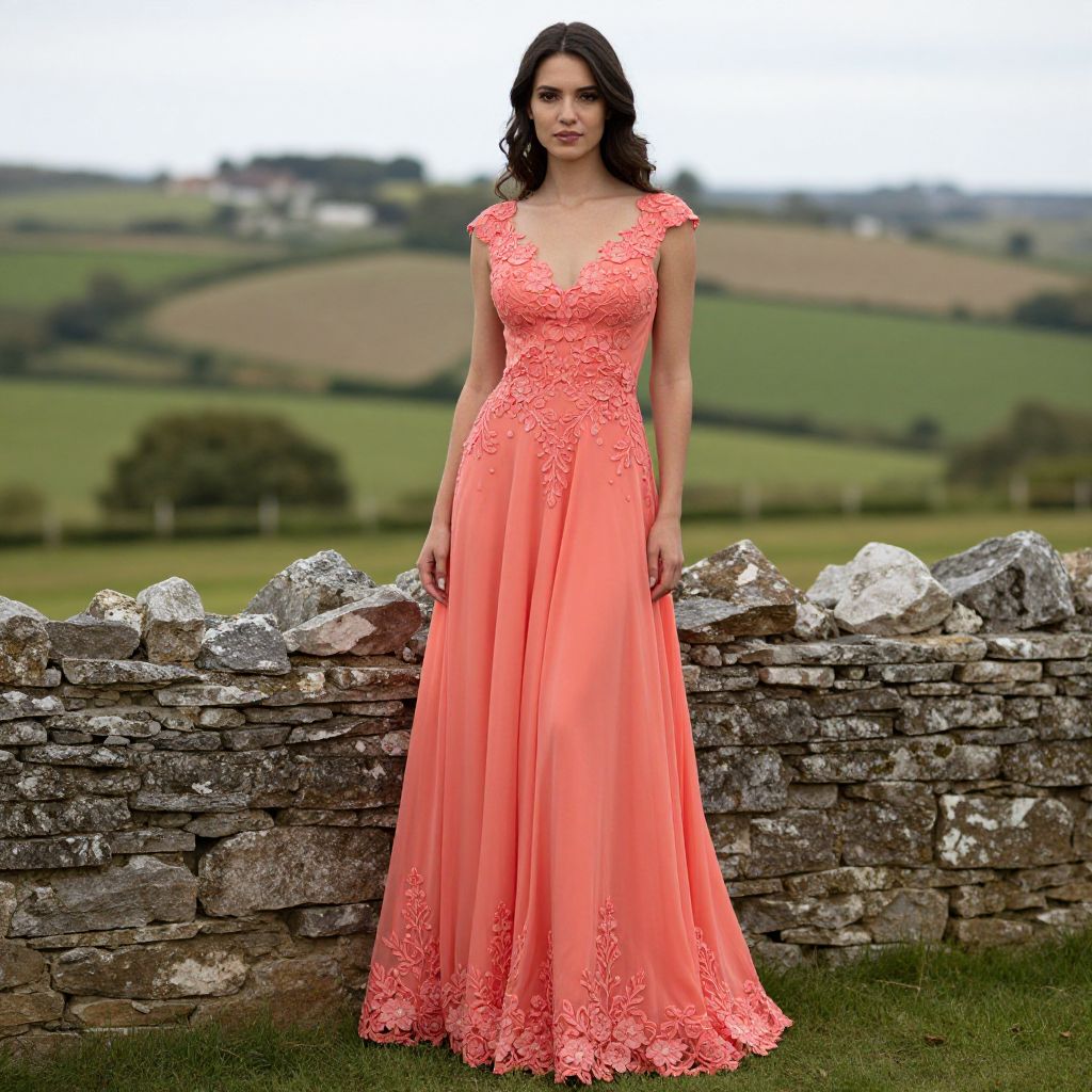 Elegant woman standing gracefully against a stone wall backdrop, wearing a flowing coral gown adorned with intricate floral lace detailing, set against a serene countryside landscape.