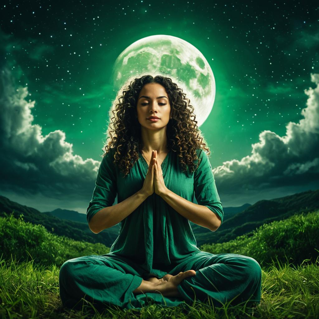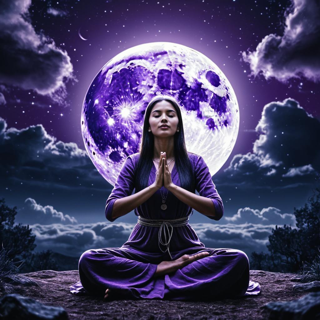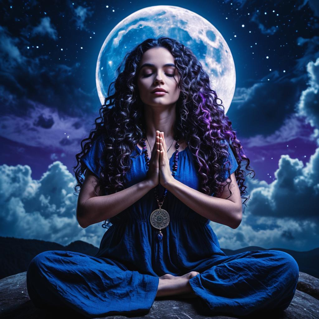 Sans Serif woman with long loose curls, meditating with hands in prayer pose, mystical fantasy scene, large full moon, dramatic sky, detailed, bright deep blue and violet colors, dramatic lighting, 8k, 5d canon.