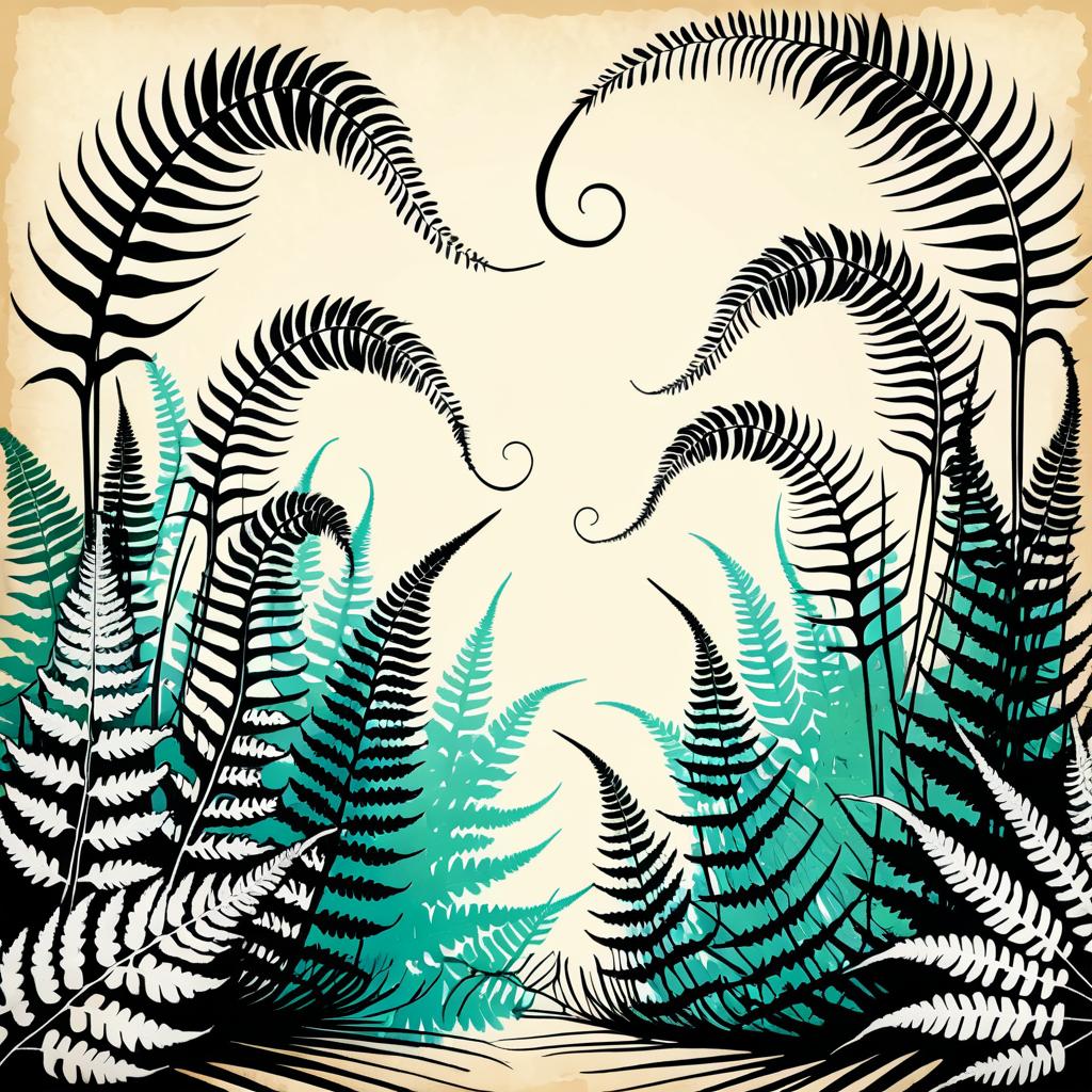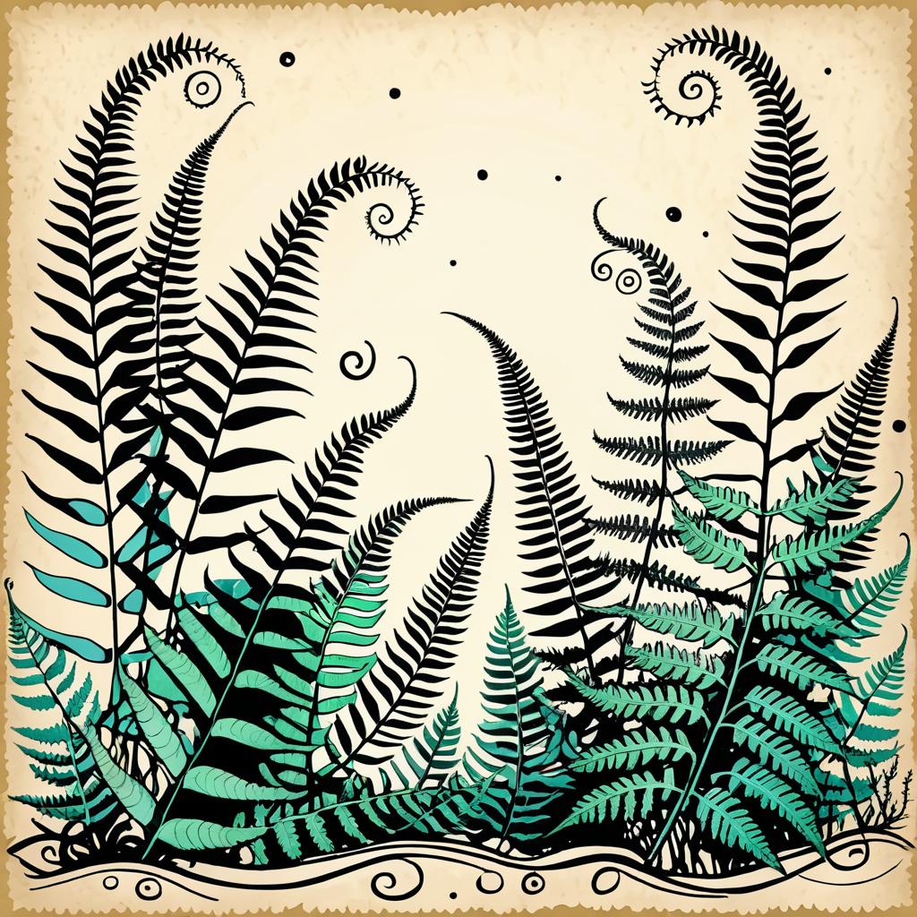 Line art: mystical ferns sketched in Tim Burton against retro paper