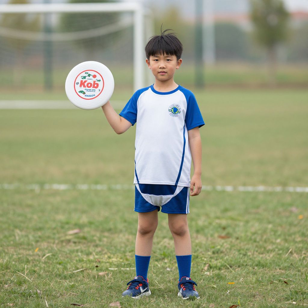 Photograph of an Asian boy with black hair, wearing a white and blue soccer shirt, shorts, socks, and shoes, holding a Kobakun