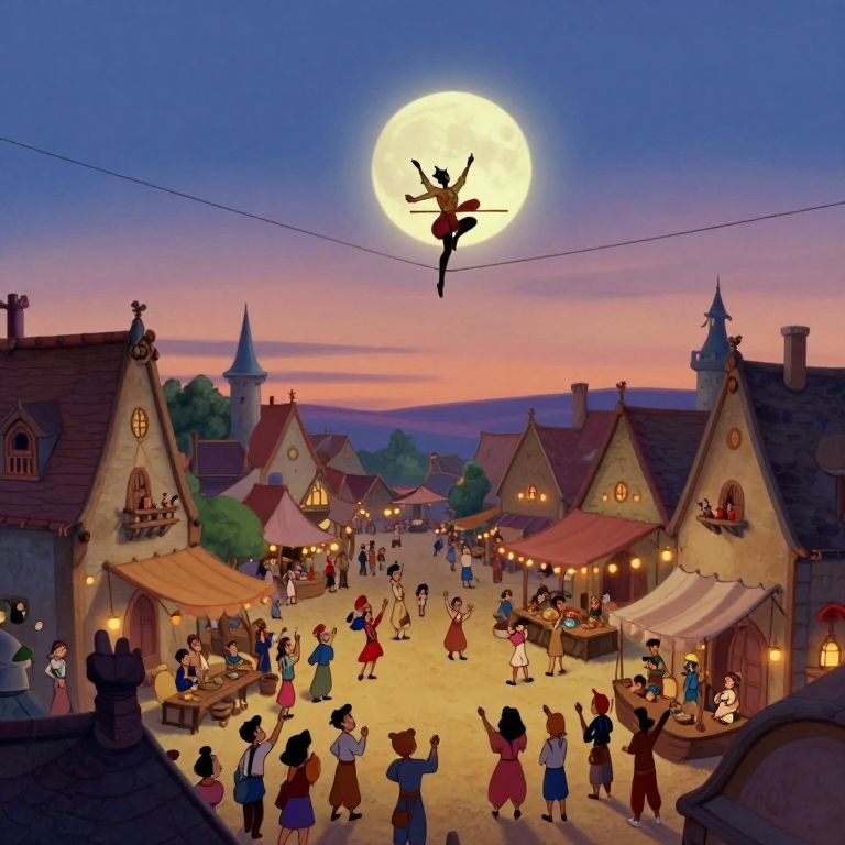 Craft an image in the enchanting style reminiscent of classic Disney animations, showcasing an aerial perspective over a vibrant medieval marketplace during golden hour. The scene is characterized by warm colors and soft lighting that bathes the lively crowd below, under a serene twilight sky. At its heart, a jestering acrobat performs daring maneuvers on a high-wire stretched above the market, drawing cheers from the gathered townspeople. As the camera lifts, the acrobat's silhouette gradually dissolves against a celestial backdrop featuring a luminous full moon ascending gracefully over the scene, creating an atmosphere of magic and wonder that stirs both wistfulness and awe.