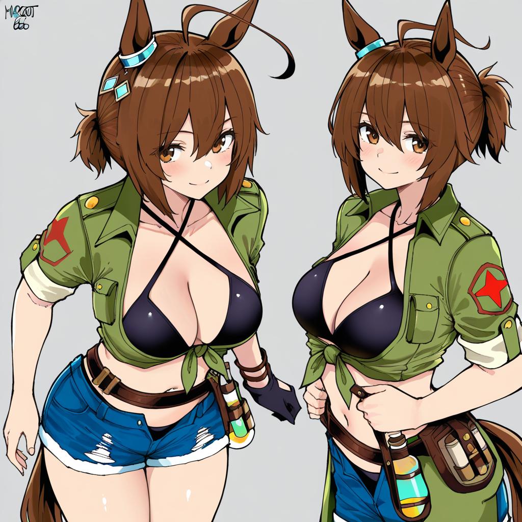 Digital illustration of a young anime girl with short brown twintails adorned with yellow star hair ornaments. She has brown eyes, freckles, and wears a Saunders military-style uniform with a star emblem on the sleeve. The character has a serious expression and is depicted in two poses against a plain grey background.