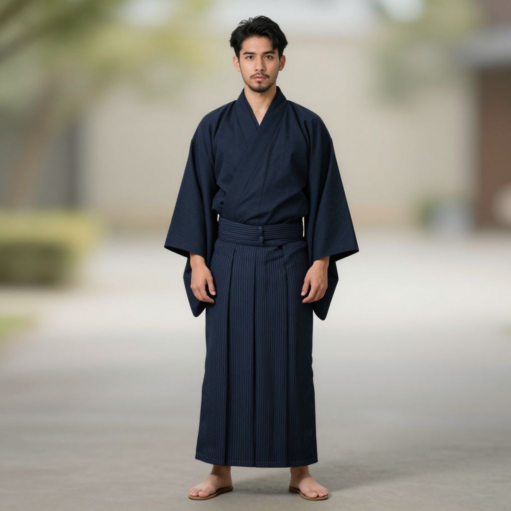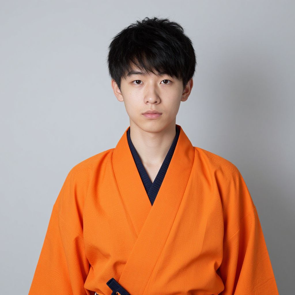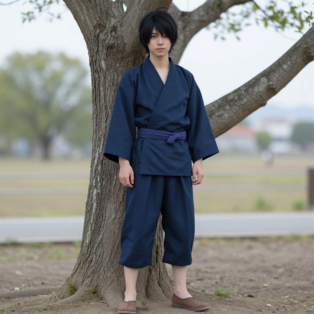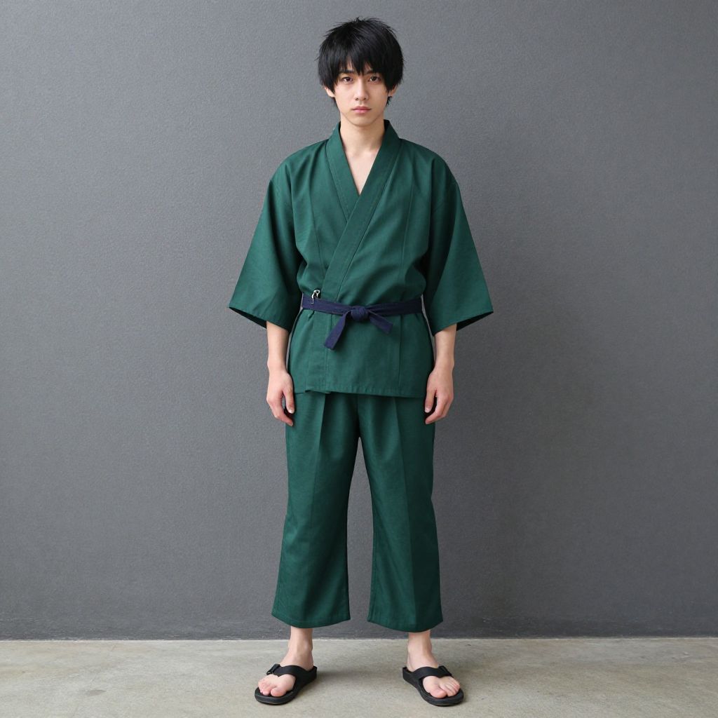 "green outfit costume, 1boy, male focus, solo, black hair, standing, japanese clothes, full body, sandals Realistic photo of casual sexy person with pretty face"
