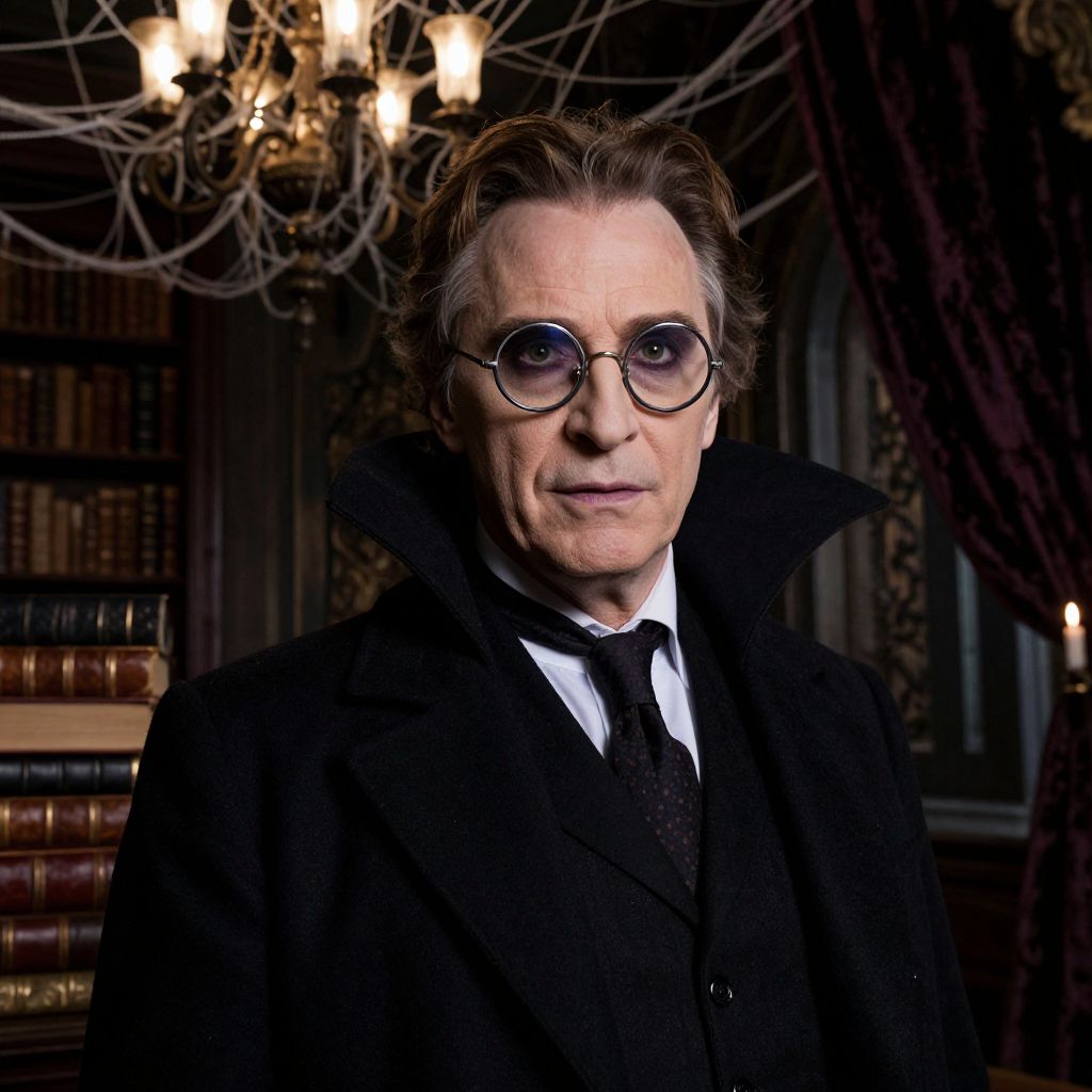 Photograph of an older white man with gray hair, wearing round glasses, a black overcoat with a high collar, and a black tie over a white shirt. He has a serious expression. The background features a dimly lit, ornate room with a chandelier with glowing lights, dark velvet curtains, and a bookshelf filled with leather-bound books. The overall style is reminiscent of a Gothic or Victorian setting, with rich, dark colors and intricate details.