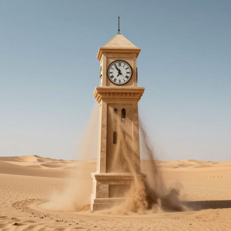 A clock tower in the center of a desert gradually dissolves into time itself, with grains of sand vanishing into different eras.