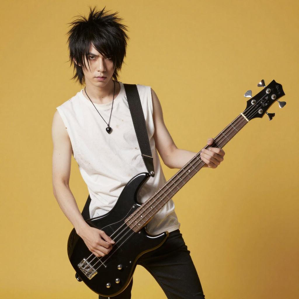 Photograph of a slim, pale-skinned man with spiky black hair, wearing a stained white sleeveless shirt and black pants, holding a black electric bass guitar. He stands against a bright yellow background, looking intently at the camera. He wears a black necklace with a small pendant. The bass guitar is angled towards the viewer.