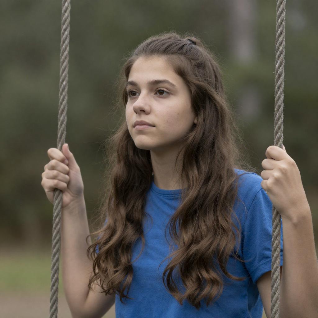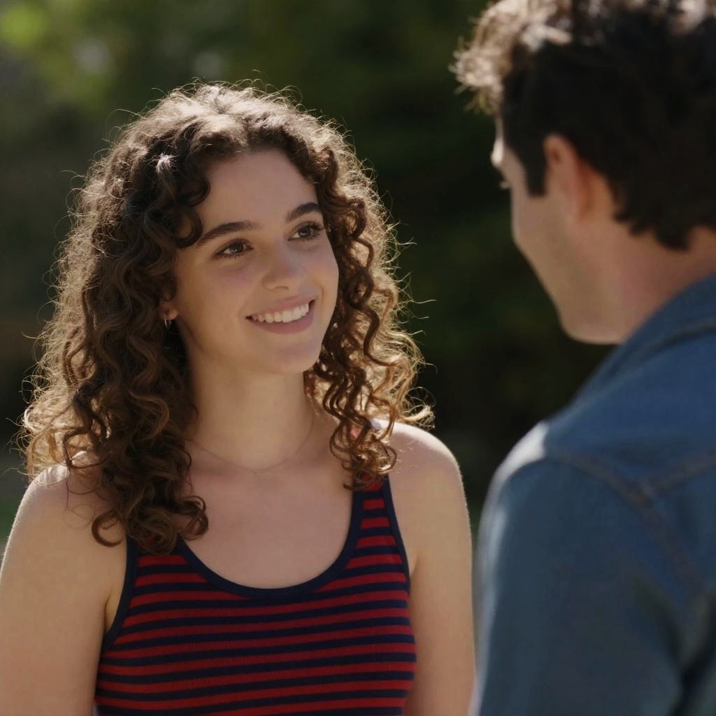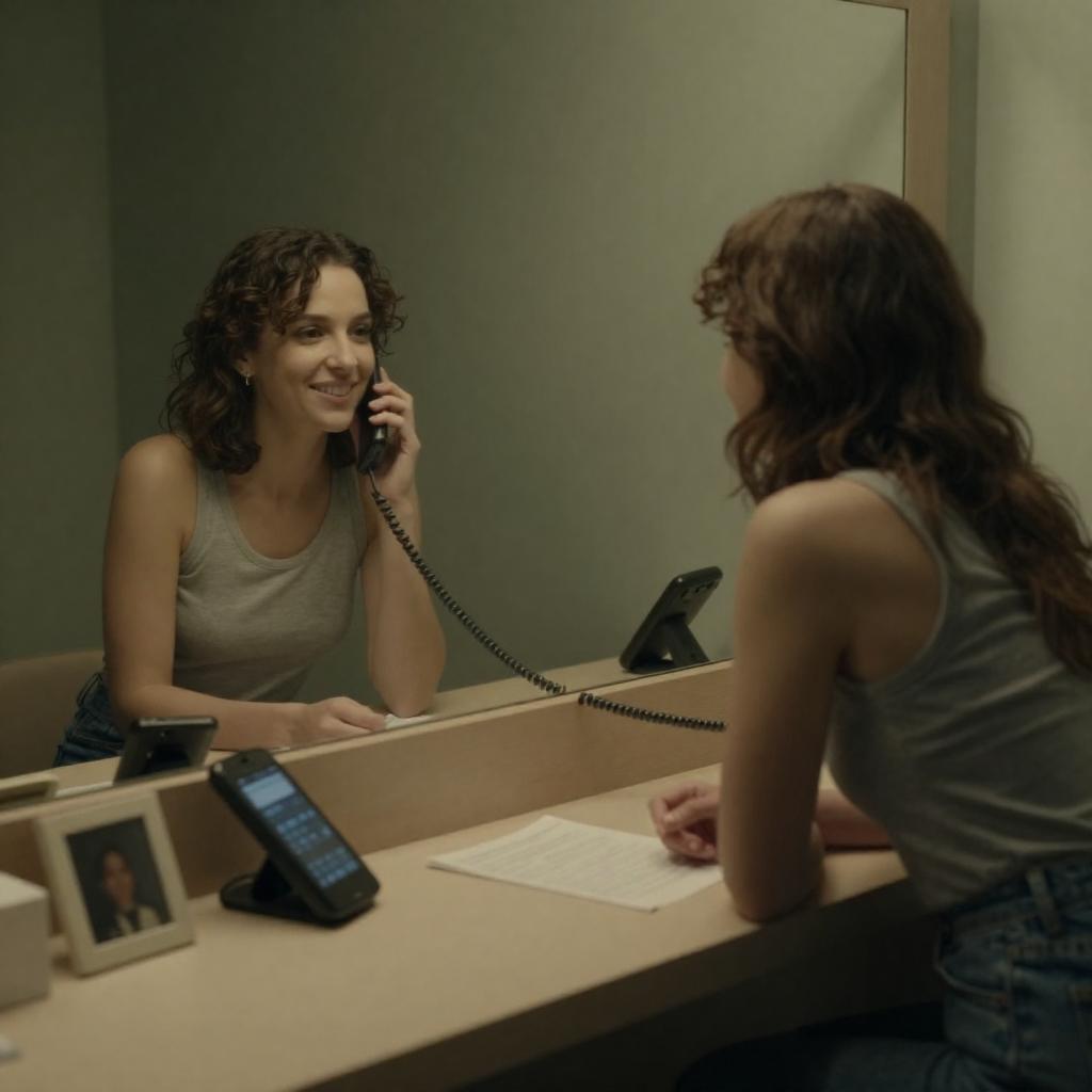 Young woman with long brown hair, wearing a pink patterned shirt, smiling while holding a red phone to her ear. Green forest background, soft sunlight filtering through leaves. She is slightly turned to the right, head tilted slightly.