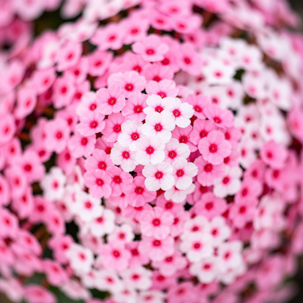 Close-up image of a dense cluster of small flowers featuring pink and white petals with red centers, creating a vibrant floral background.