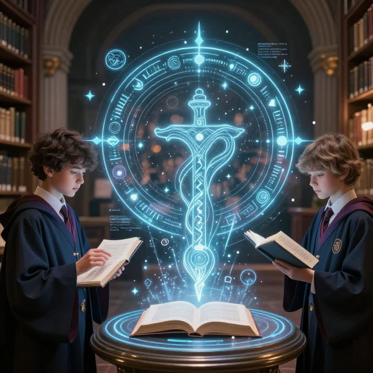 Magicschool.ia, a futuristic magic academy blending ancient mysticism and cutting-edge AI technology, glowing runes combined with holographic interfaces, students in robes interacting with floating digital spellbooks, ethereal and high-tech atmosphere