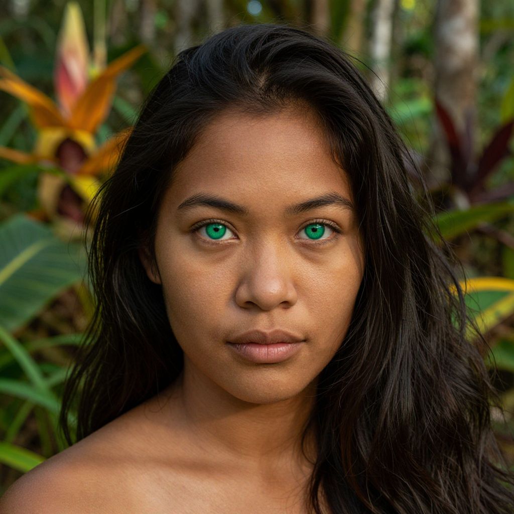 Photograph of a young woman with medium brown skin, green eyes, and long black hair, standing in a lush tropical forest. She gazes directly