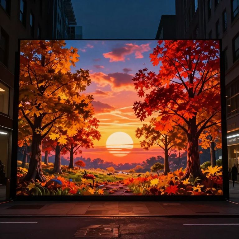 A vivid digital art installation transforms a dark urban space into a surreal landscape, featuring vibrant, computer-generated autumnal trees and a radiant sunset sky, illuminated by dramatic lighting that enhances its high-definition, otherworldly aesthetic.