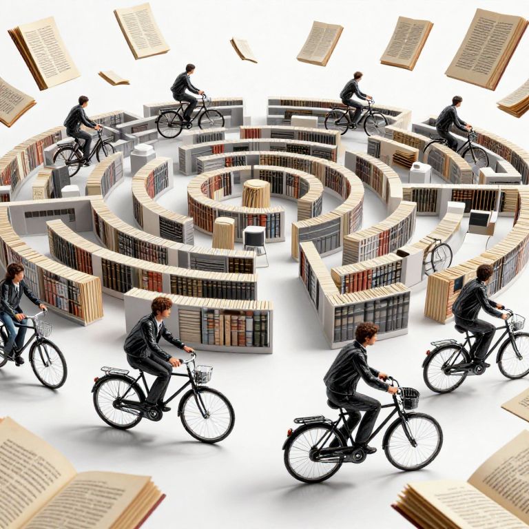 Librarians ride bicycles made of ink through a labyrinth of floating manuscripts, each page turning by itself.