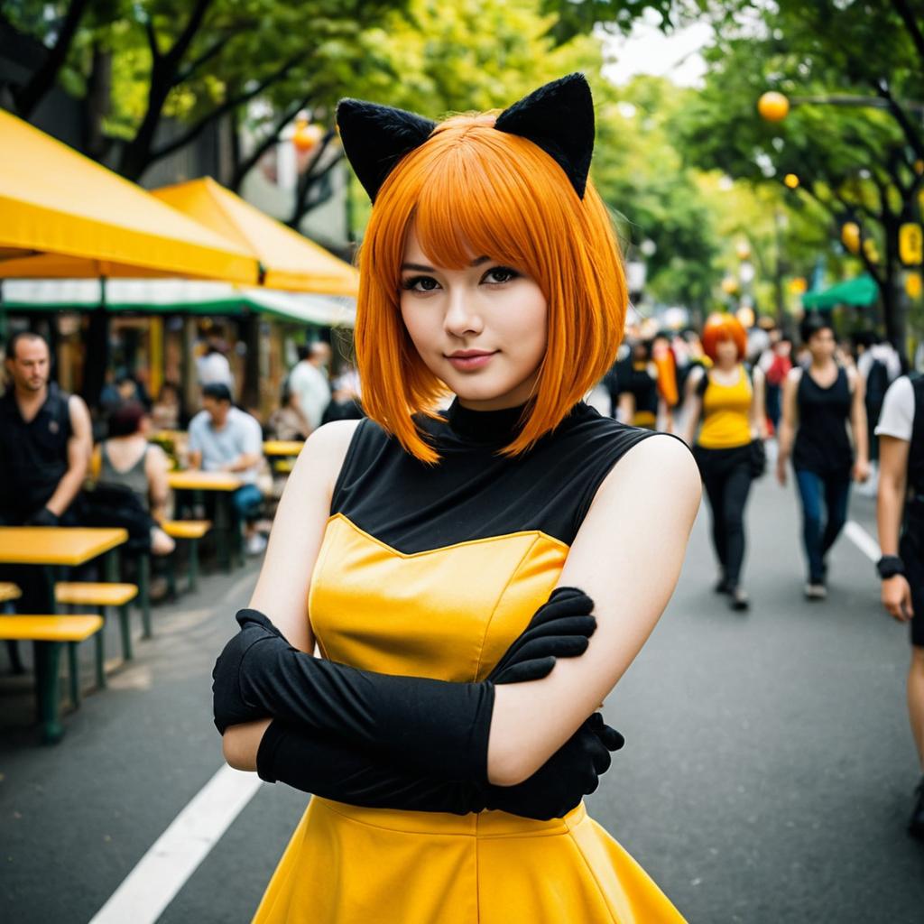 Chat noir girl cosplay, photograph, anime-style, young woman, cat ears, orange bob haircut, black and yellow sleeveless dress, black gloves, urban street background, daytime, green trees, yellow awnings, blurred pedestrians, realistic, soft lighting, cosplay, confident expression, medium shot