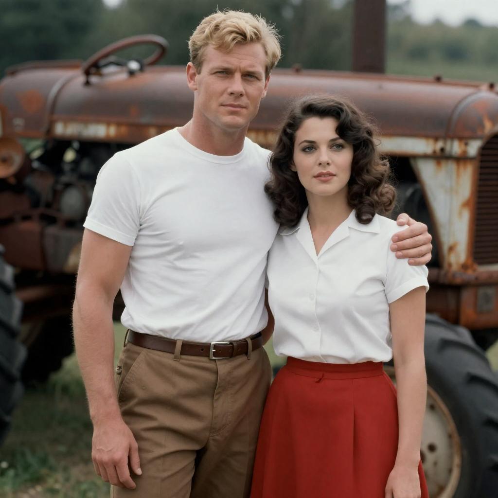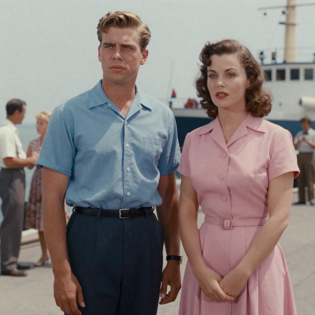 Photograph of a movie poster featuring a 1950s-style scene. A young man in a light blue shirt and dark pants stands to the left, looking serious. A woman with fair skin, brown hair, and wearing a pink, short-sleeved dress stands to the right, hands clasped. Background shows a dock with people and a ship.