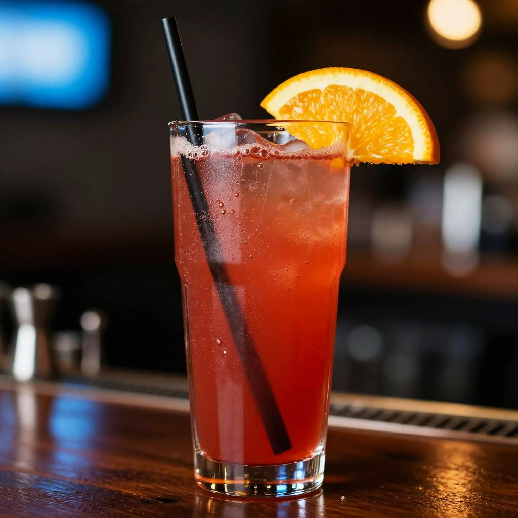 A vibrant red cocktail served in a tall clear glass with ice cubes and a black straw. The drink is garnished with a fresh orange slice on the rim. Tiny bubbles can be seen in the liquid. The glass is placed on a dark wooden bar surface with a blurred background featuring bokeh lights in blue and white, creating a lively bar atmosphere.