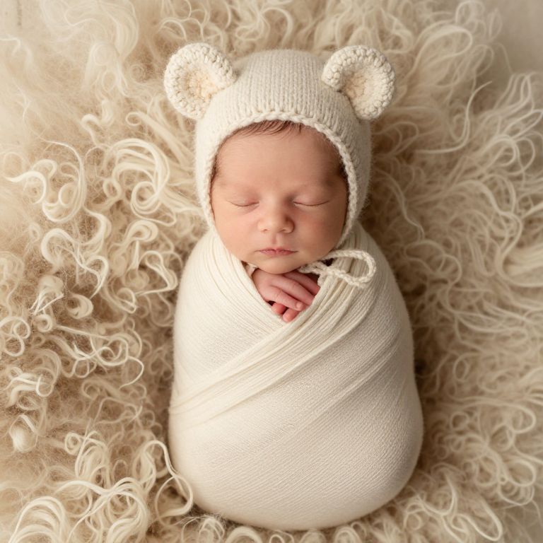 A serene newborn baby boy, swaddled in a cozy, cream-colored knit wrap and adorned with a soft, textured knitted hat featuring plush bear ears, rests peacefully on a plush, curly woolen blanket, capturing the warmth and tenderness of a high-definition, naturalistic newborn portrait.