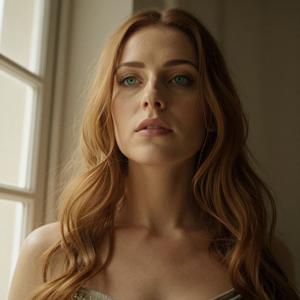 A captivating Celtic woman with piercing emerald eyes and tough features stares into the soft, warm sunlight filtering through a nearby window. Her long chestnut hair frames her face, partially obscured by a cascade of locks gently grazing her cheek. From an unconventional low-angle perspective, subtle shadows cast across her elegant neckline add to the mystery. This photorealistic portrait combines classical realism with modern elegance, creating an emotionally charged image that transcends time and captures the enduring allure of timeless beauty.