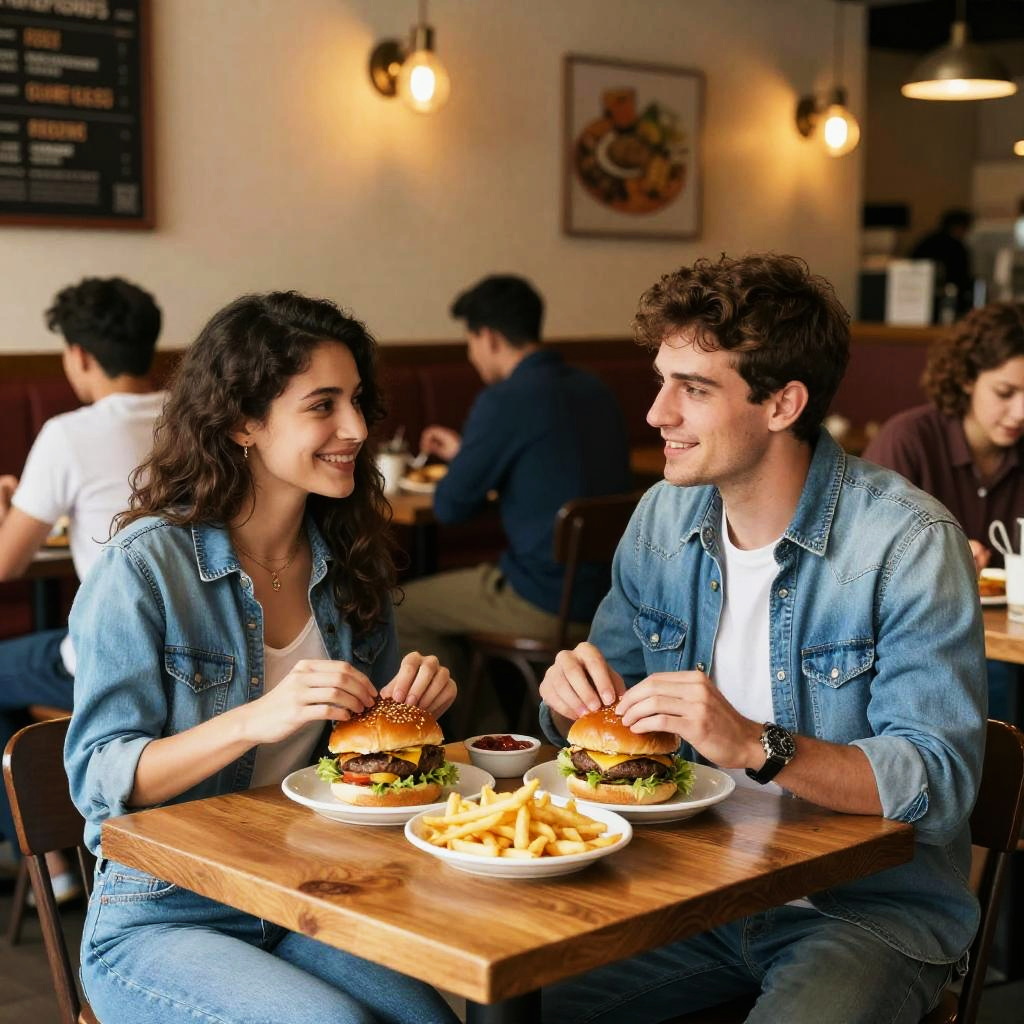 A couple enjoys a meal of burgers and fries in a casual, cozy restaurant setting. They are seated at a wooden table, surrounded by warm ambient lighting and other diners. Both the man and woman are dressed in denim outfits, evoking a relaxed, modern style.