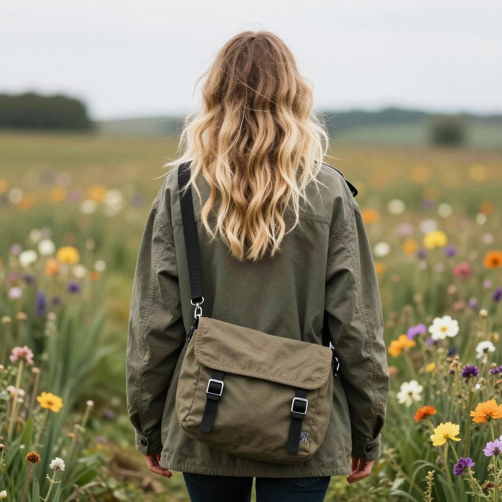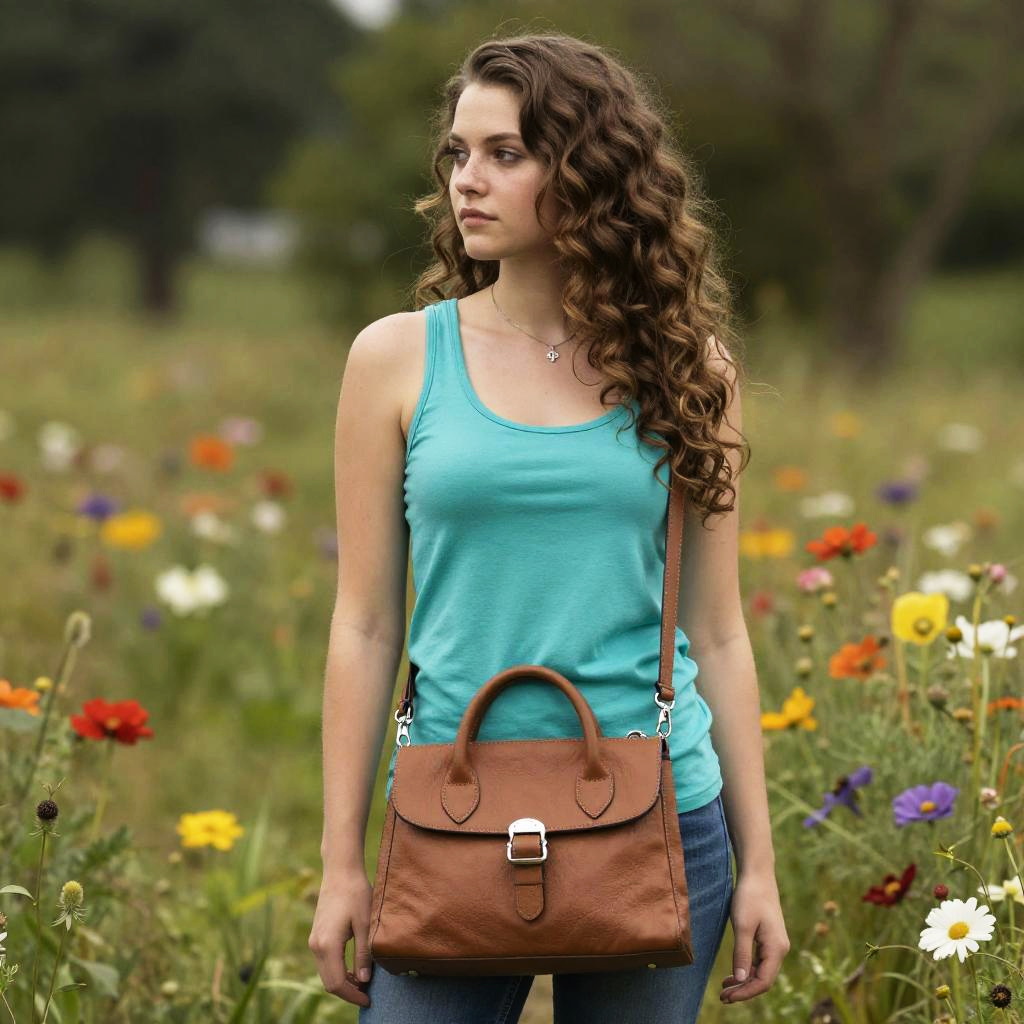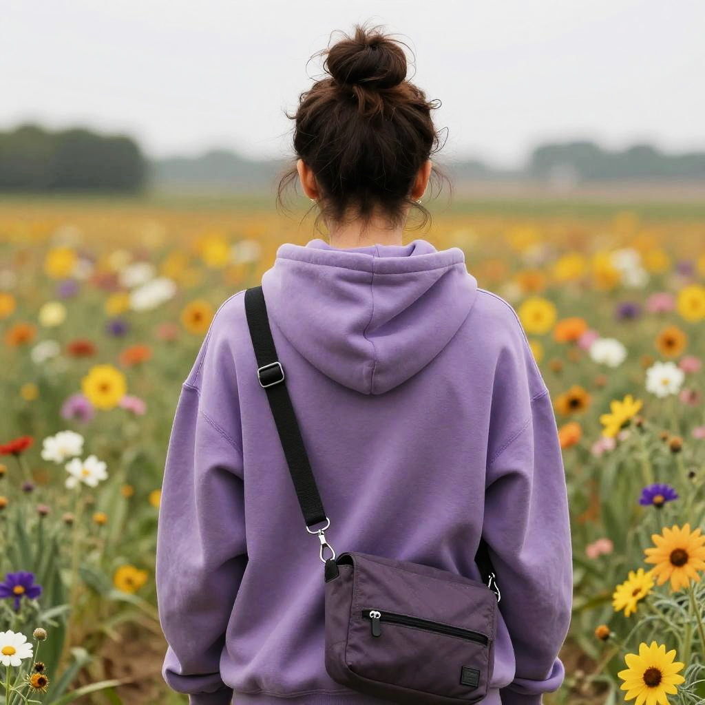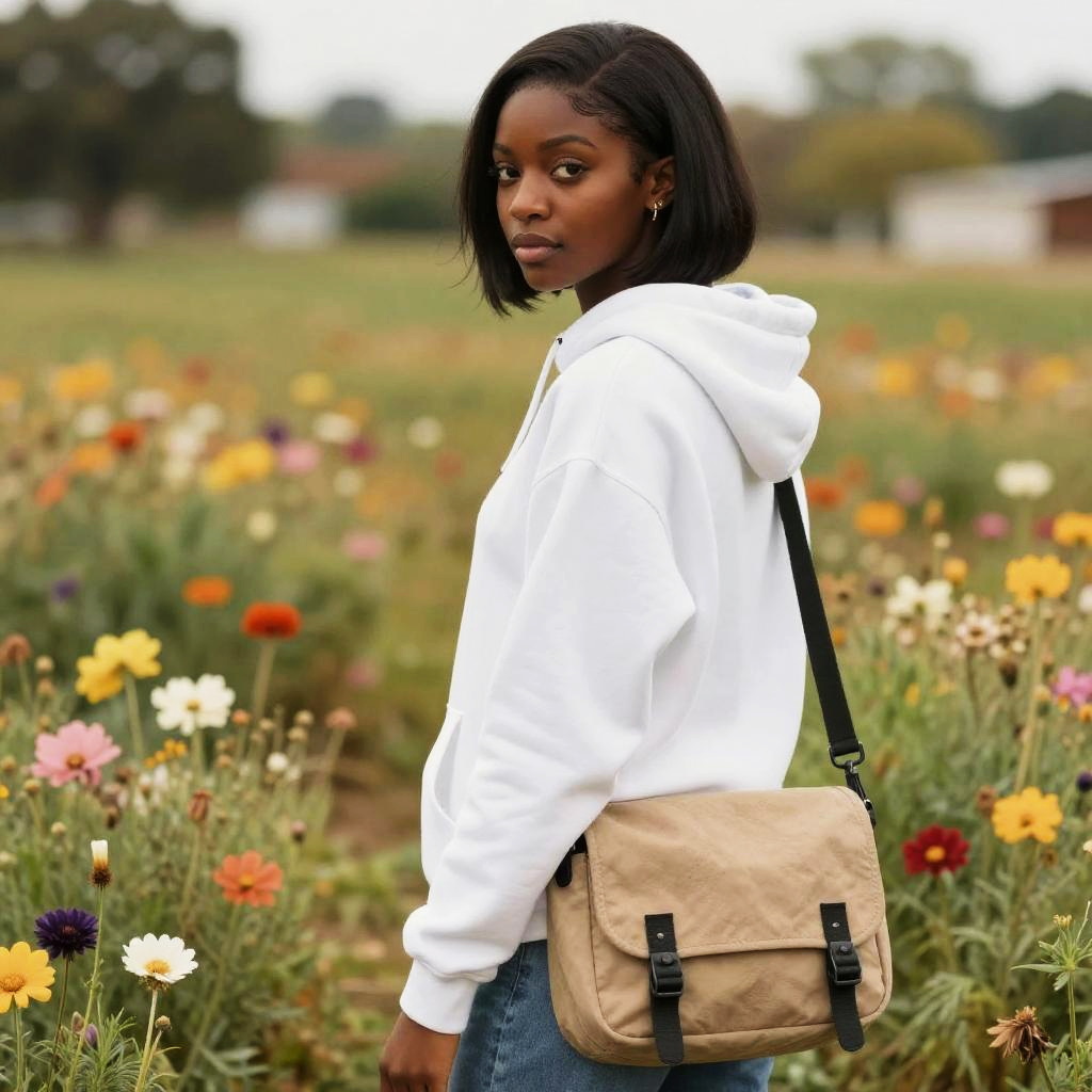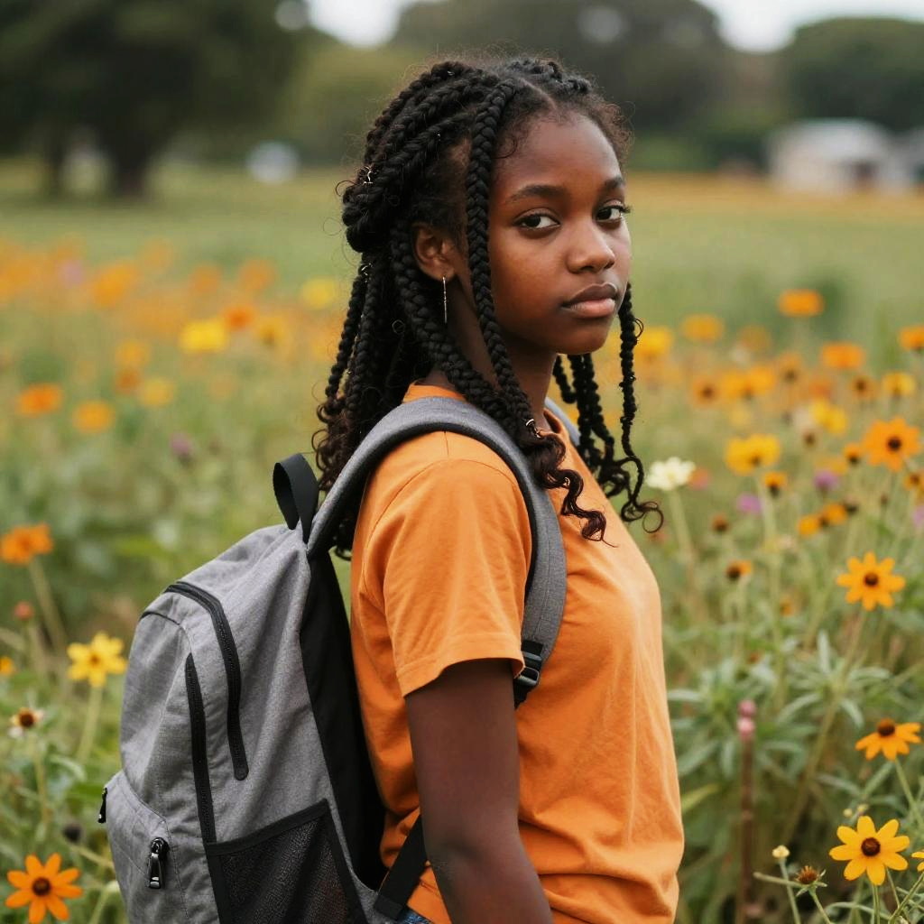 Long straight, jet black girl with pink blouse and messenger bag standing in a field of flowers