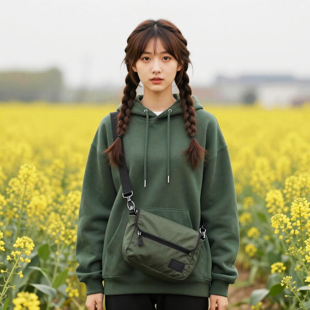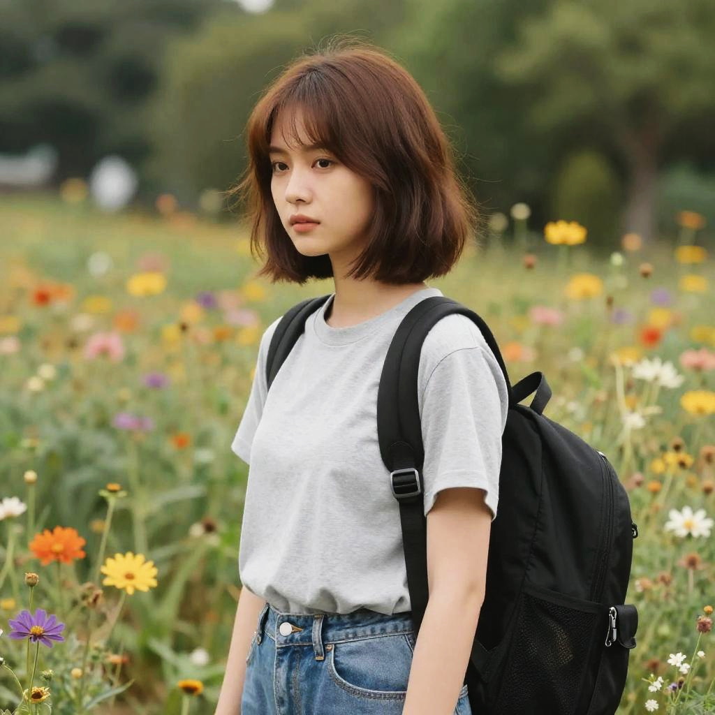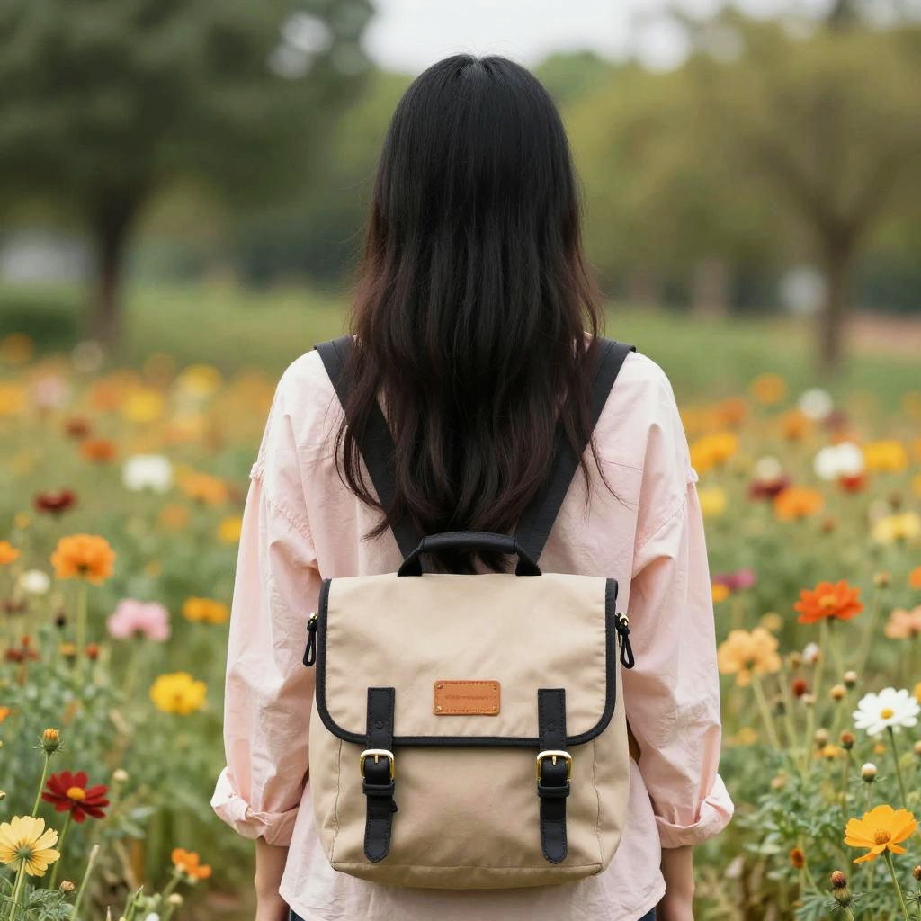 A young woman with long straight jet black hair wearing a light pink blouse and a beige messenger backpack is standing in a colorful flower field. The flowers are predominantly orange, yellow, and white with green foliage. The background shows a horizon with distant trees and buildings under a cloudy sky.