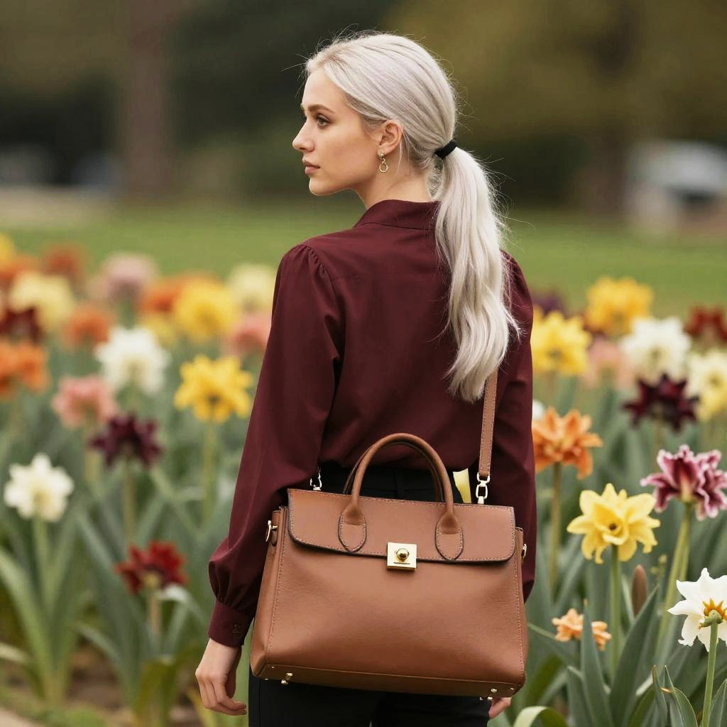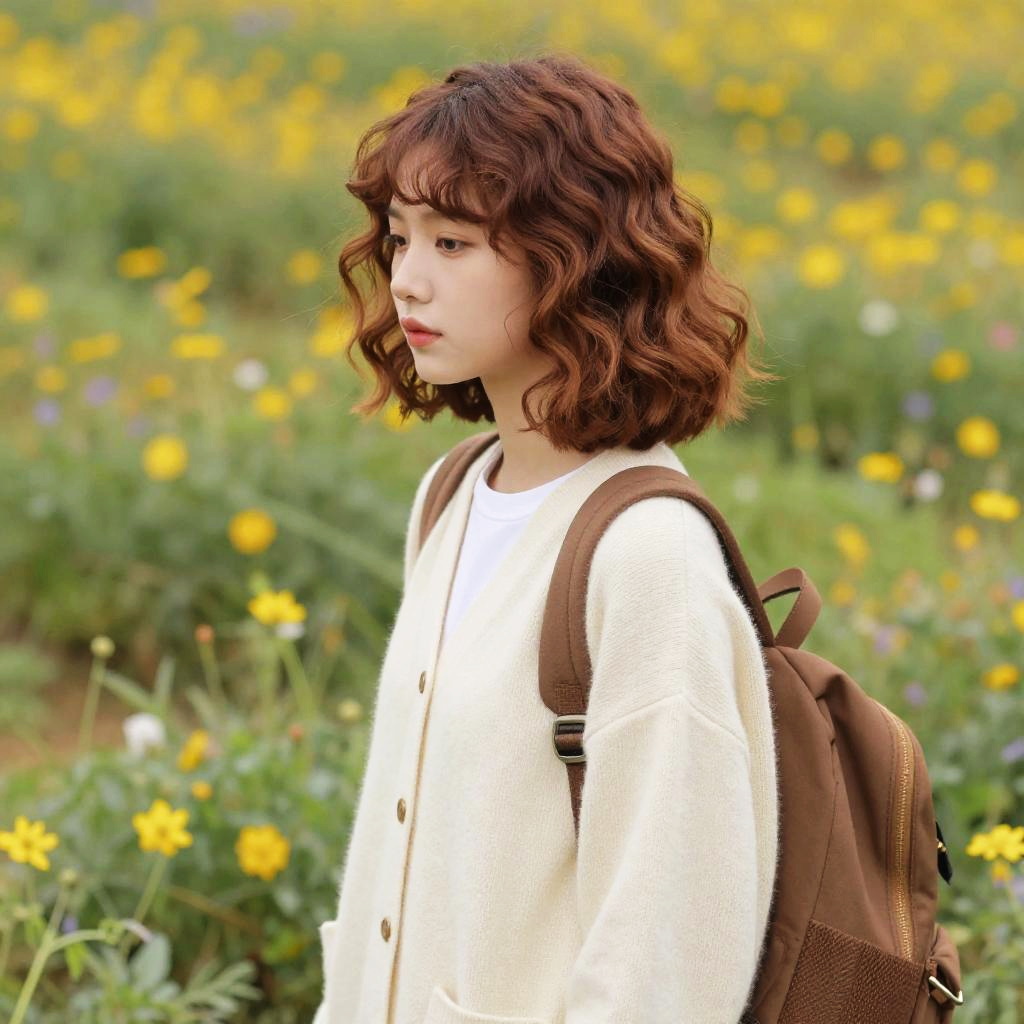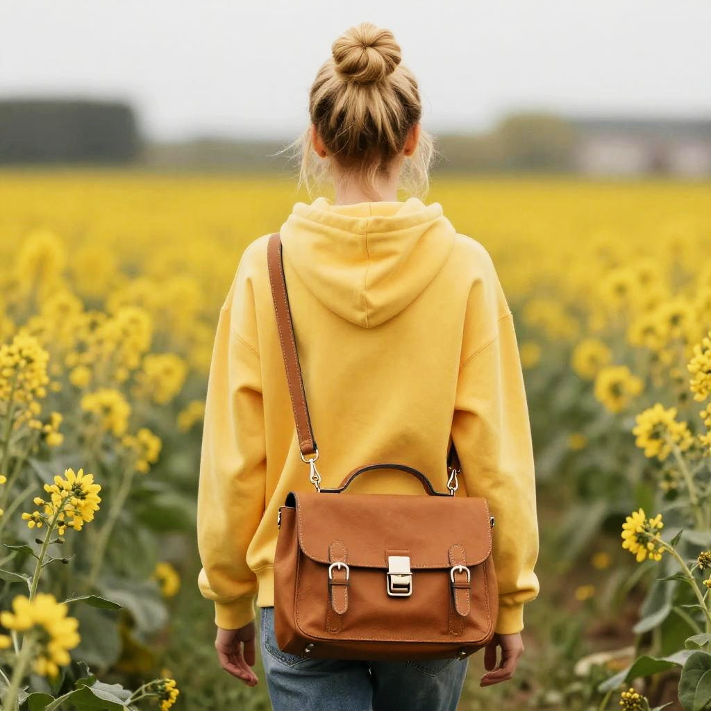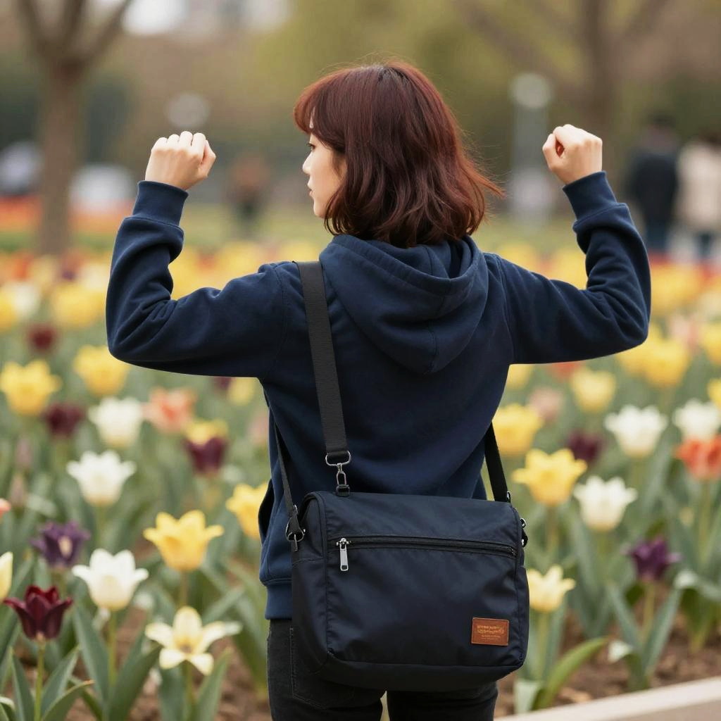 A young woman with long straight jet black hair wearing a light pink blouse and a beige messenger backpack is standing in a colorful flower field. The flowers are predominantly orange, yellow, and white with green foliage. The background shows a horizon with distant trees and buildings under a cloudy sky.
