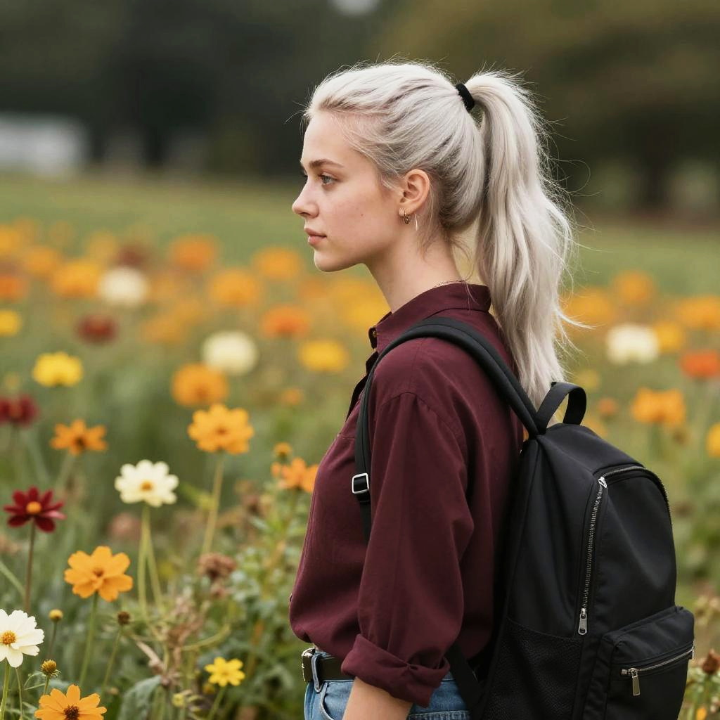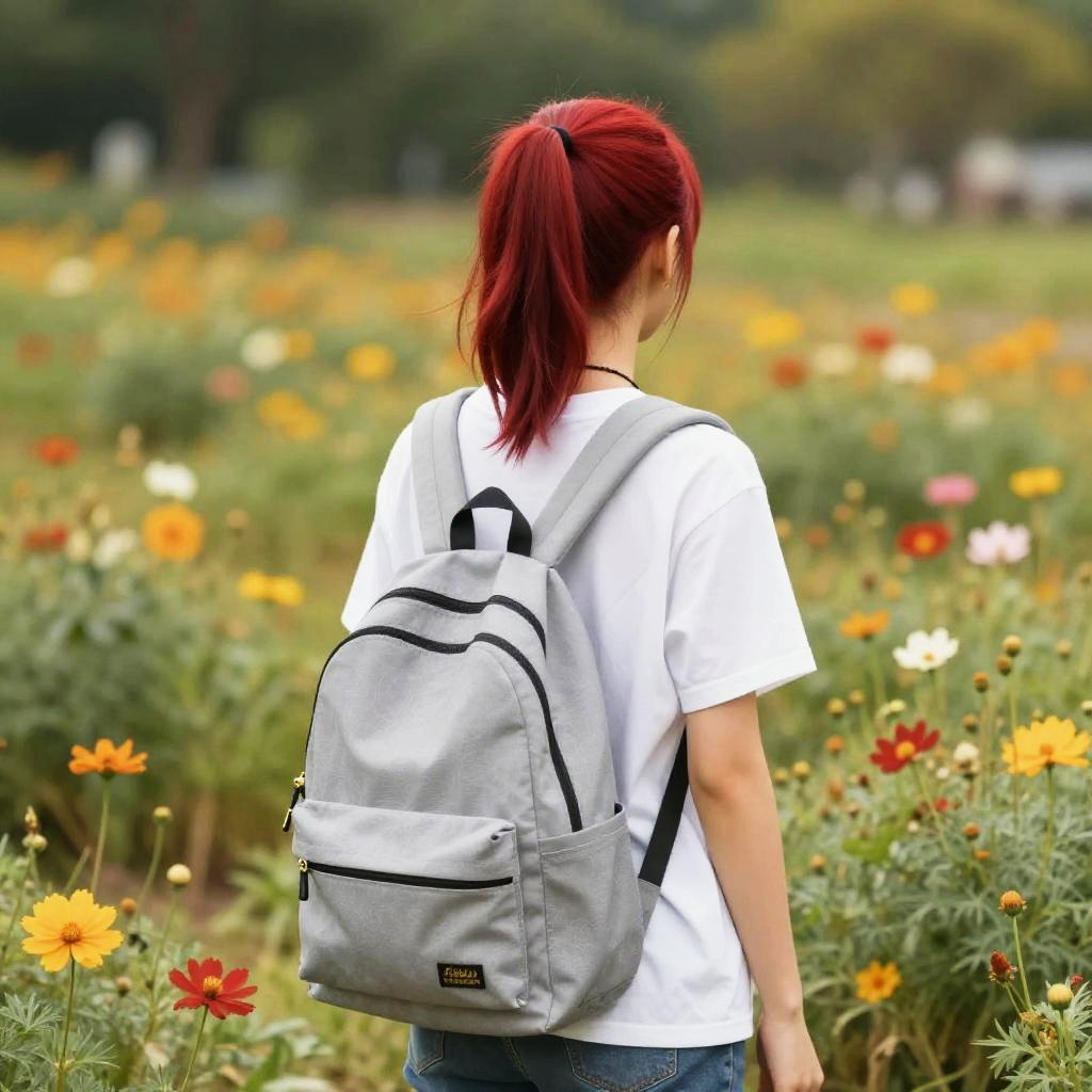 Woman with Backpack in Flower Field