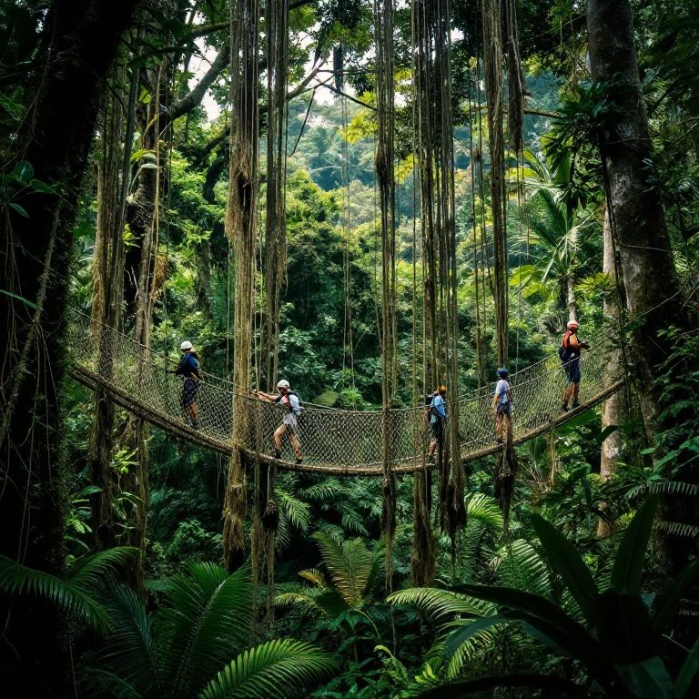 Photograph of a dense, lush jungle with a suspended wooden and net bridge. Six people, four men and two women, wearing casual outdoor clothes and helmets, walk across the bridge. The bridge hangs between tall, thick trees with vibrant green foliage. Sunlight filters through the canopy, casting dappled light on the forest floor, which is covered in ferns and underbrush. The background shows a dense, verdant jungle with towering trees and hanging vines. The image conveys a sense of adventure and exploration in a tropical rainforest.