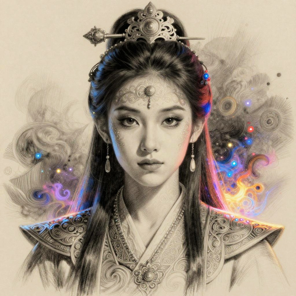 An imaginative sketch to AI art transformation where a fantasy character sketch evolves into a vibrant AI-generated digital portrait, combining fine pencil details with luminous textures, intricate patterns, and a mystical background filled with floating particles and light effects.