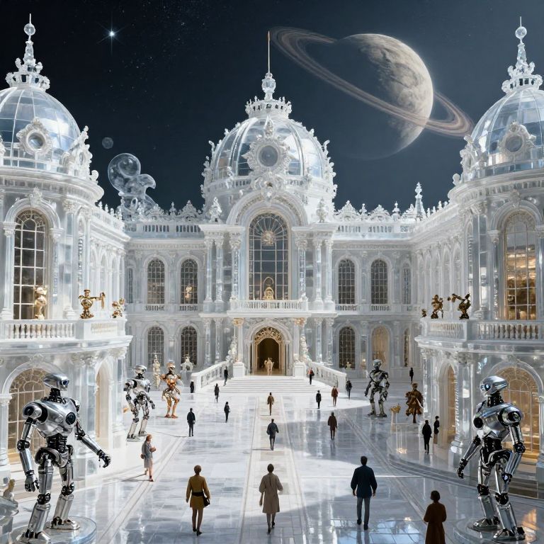 Curiosity baroque sci-fi futuristic palace, crystalline, versailles, streets are bustling with Syd Mead-style Rococo robots and automatons, ringed planet seen in sky,