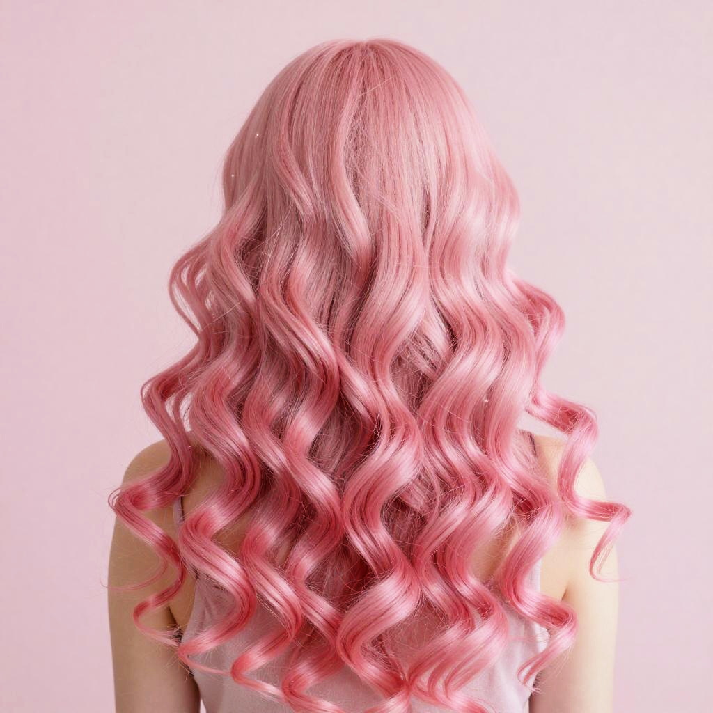 Pink curly hair cascading over shoulders, soft pastel background, whimsical and vibrant style, high detail, glowing strands, dreamy atmosphere