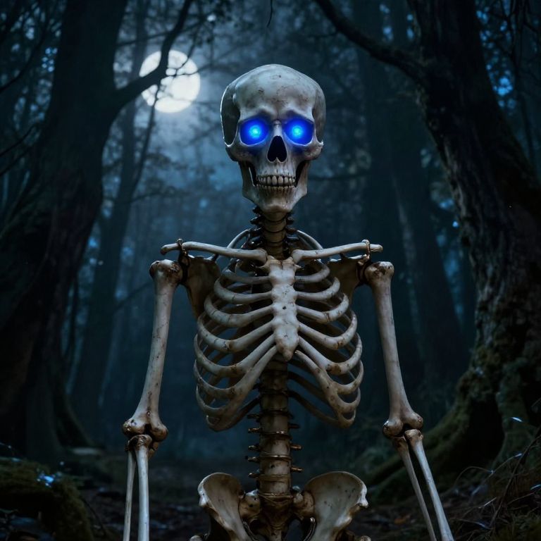 A mysterious skeleton with glowing blue eyes, standing in a dark enchanted forest, moonlight filtering through twisted branches, eerie atmosphere, highly detailed bones and vibrant eye glow, fantasy art style.