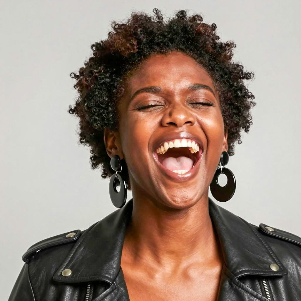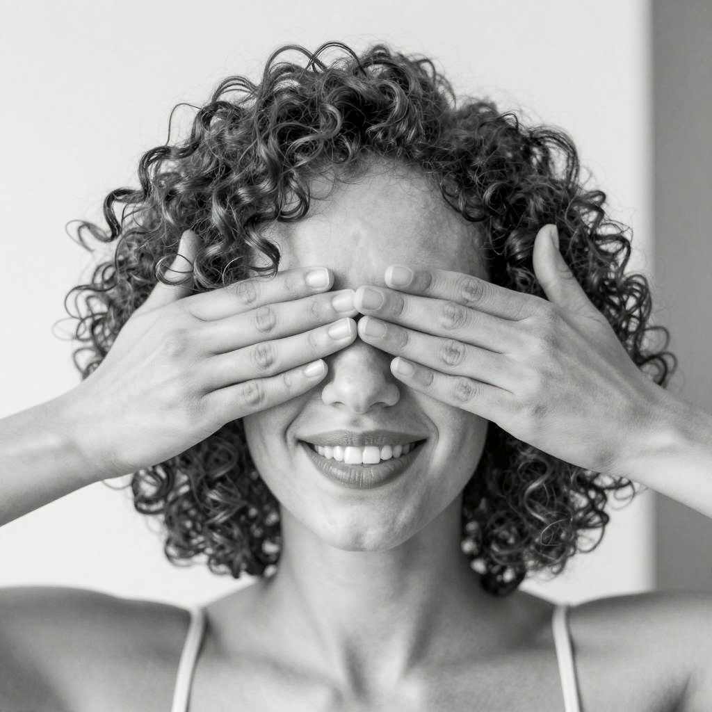 Black and white photograph of a woman with curly, shoulder-length hair covering her eyes. She has light skin, parted lips with visible teeth, and wears a thin-strapped top. Background is blurred. Her head is tilted slightly forward.