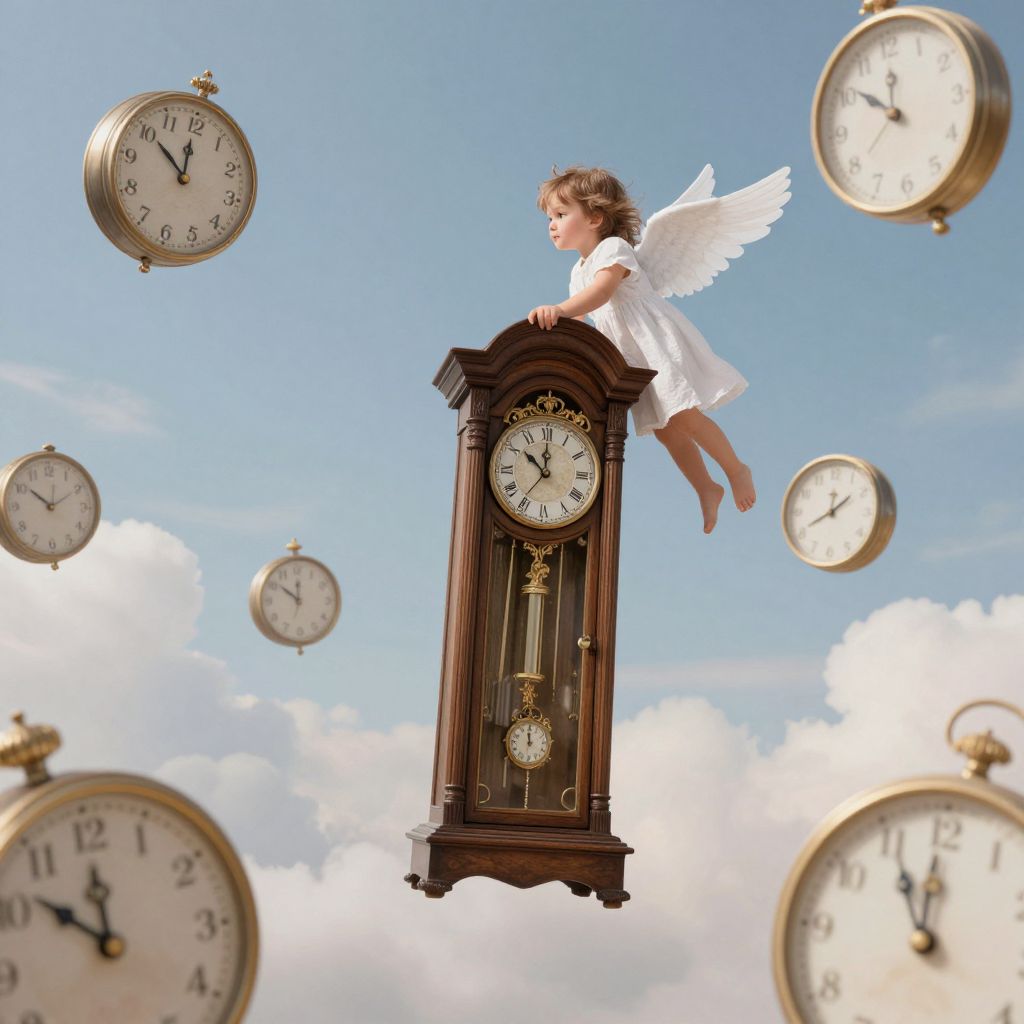 In a whimsical digital illustration, a child with angelic wings perches atop a flying grandfather clock, soaring through a surreal sky filled with floating clocks, each displaying varying times and evoking a blend of fantasy and timeless wonder.