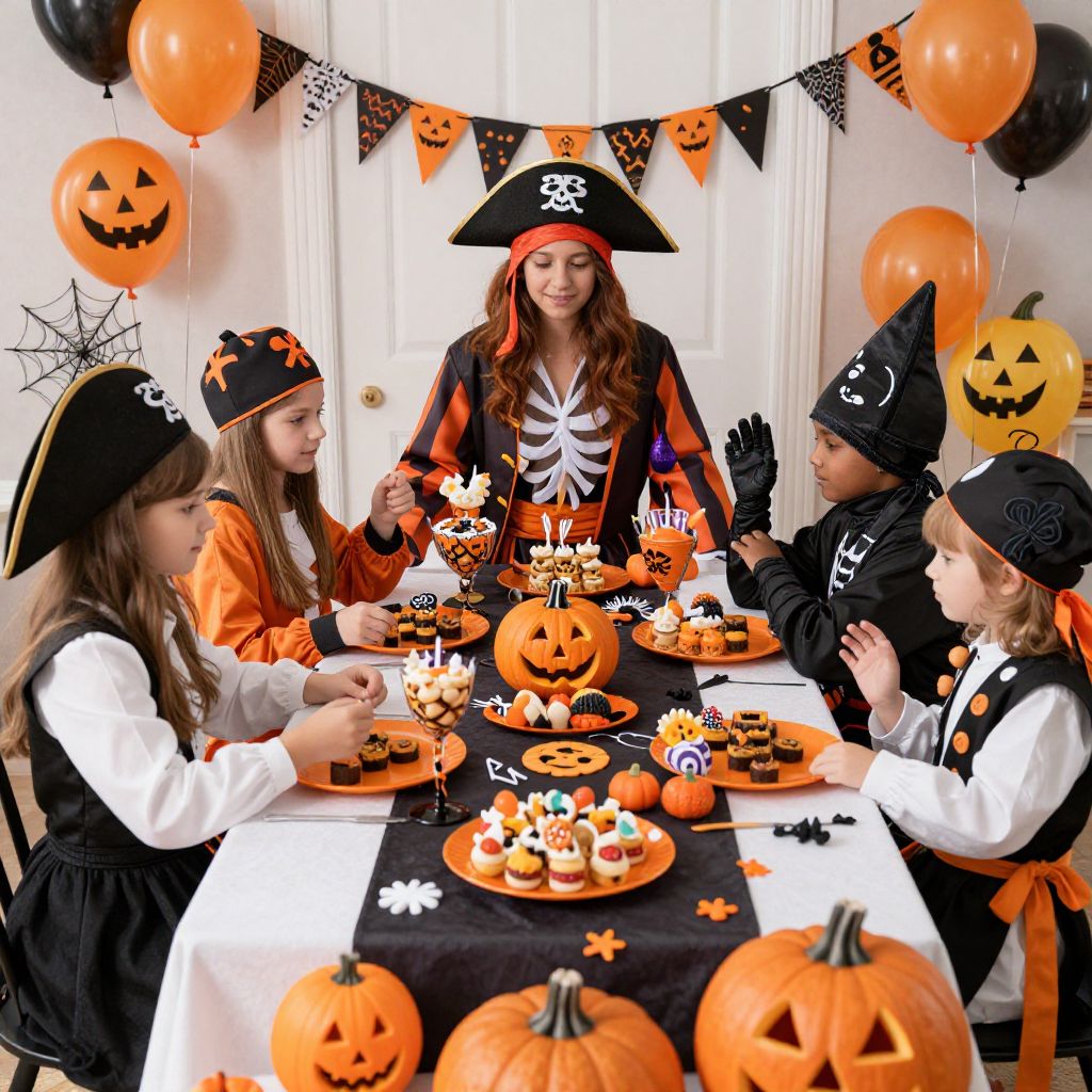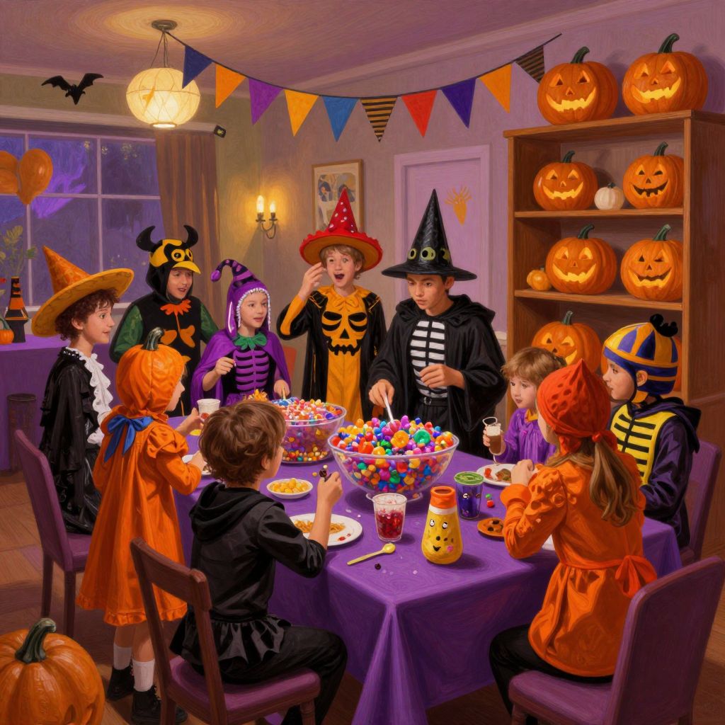 Helloween party indoors with vibrant decorations, children and adults dressed in creative costumes, candy bowls overflowing, carved pumpkins glowing on shelves, warm ambient lighting creating a cozy yet thrilling celebration scene, digital painting with lively colors.