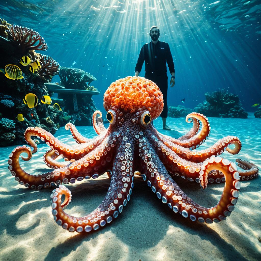 Octopus made of crystal sticked together and has come to life. The sugar now looks like a real man and is 1.7 meters tall, very tall. The sugar man has an ultra-realistic face. The sugar man is standing next to a coral reef and suspiciously eyes the swimming pool. The sugar glitters beautifully in the sunlight. Real-Life photo shot, full-Body photo, 8K UHD, many details, Award-winning.