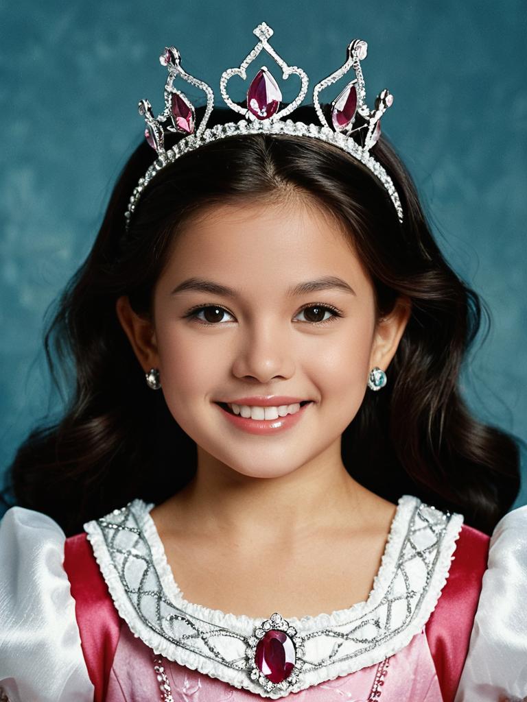 Close-up portrait of a smiling young girl wearing a pink and white princess costume adorned with a decorative gemstone and glittery details. She has dark brown hair styled in loose waves and wears a silver tiara with purple gemstones and matching earrings. The background is a soft blue, highlighting the cheerful expression and regal outfit.