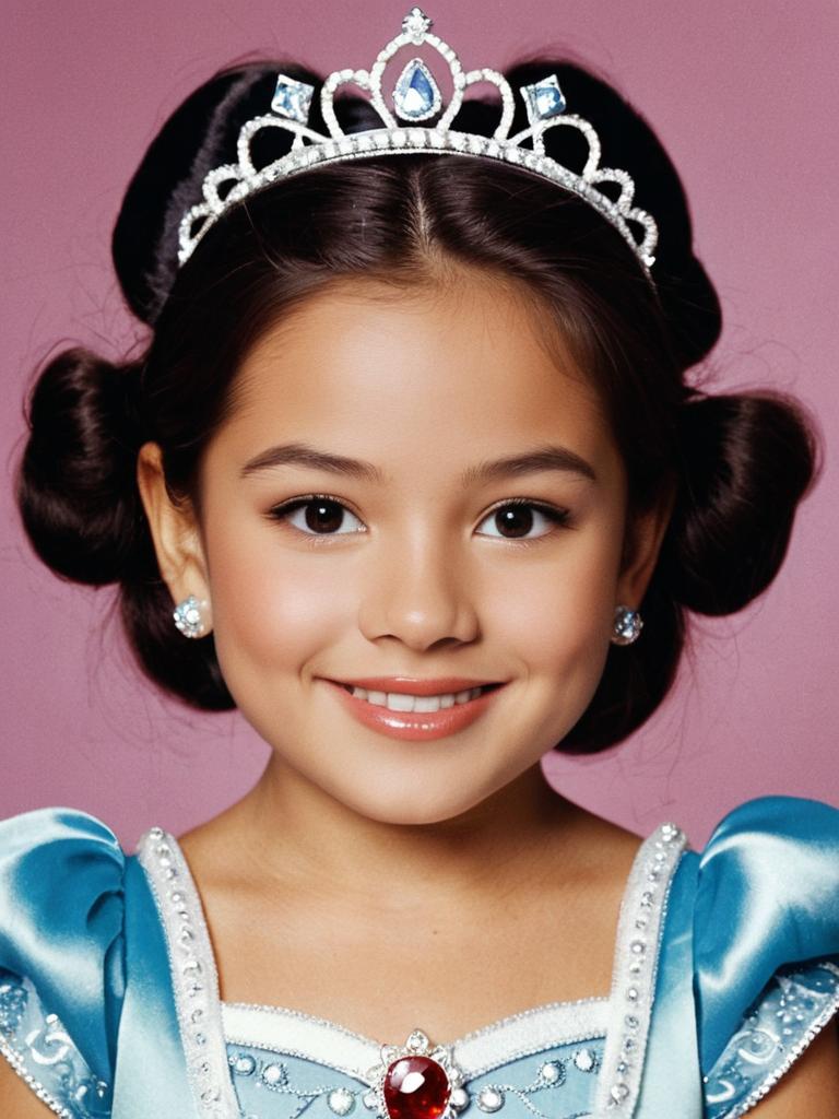 Child in Disney Princess Frame Costume, close-up cheerful headshot with tiara