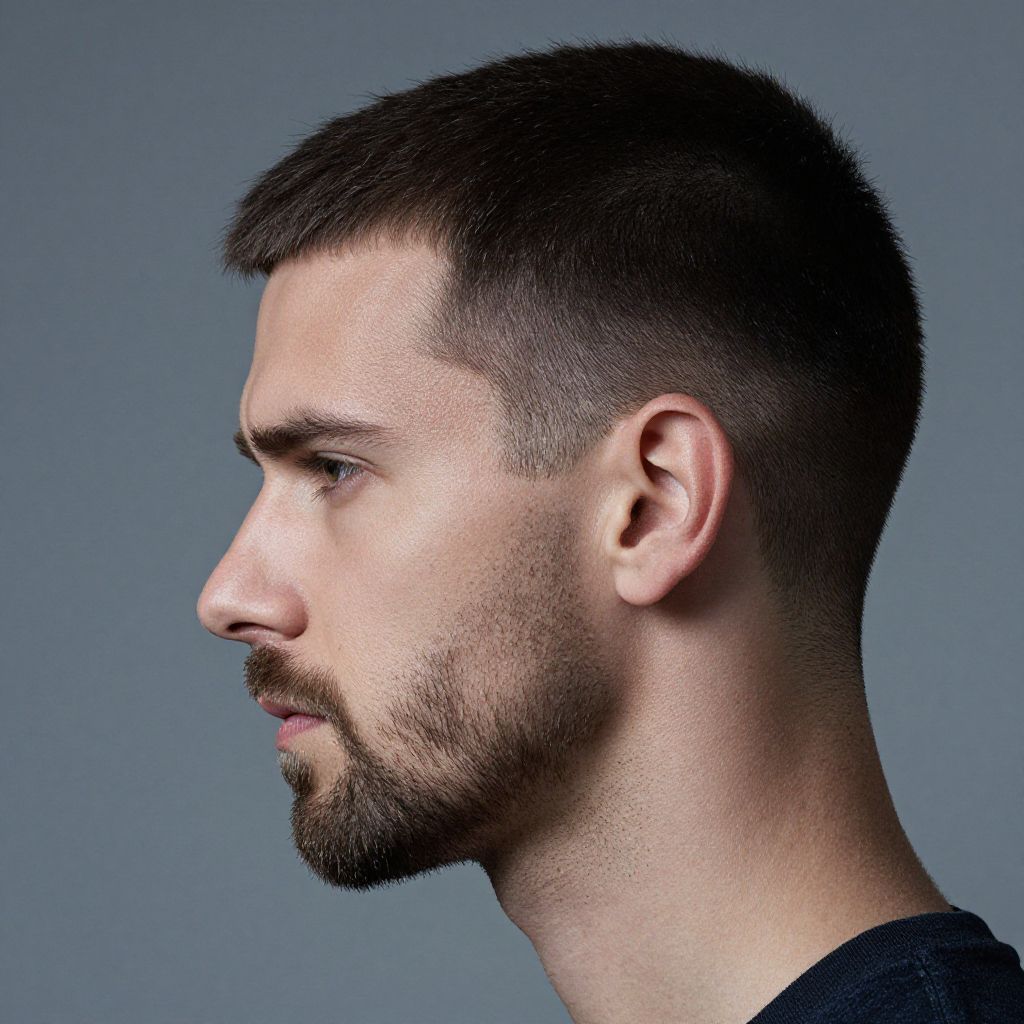 Side profile of a man featuring a pronounced French cut beard, cool-toned lighting highlighting defined beard edges and slight stubble texture, minimalist studio background, emphasizing masculinity and detailed grooming precision.