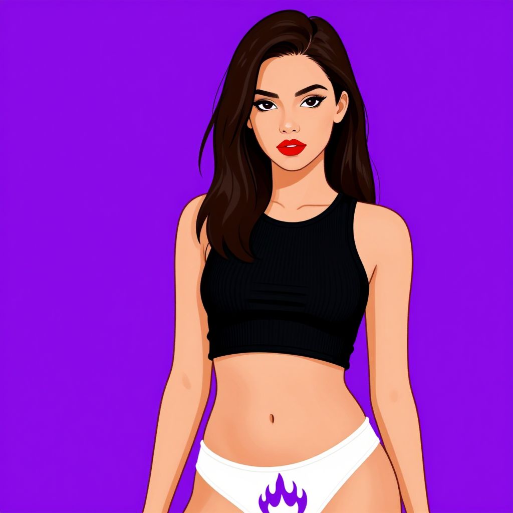 This is a digital drawing of a young woman with long, dark brown hair and fair skin. She's wearing a black, ribbed crop top and white panties with a purple flame design. The background is a solid, vibrant purple. She has a confident expression with red lips and dark eyes. The style is bold and colorful, with clean lines and a slightly cartoonish look.