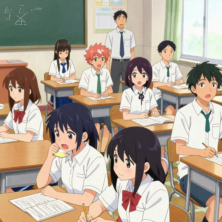 Anime images to draw illustrating a lively high school classroom with diverse students engaged in various activities, bright and colorful palette, expressive faces, dynamic composition capturing everyday life moments with an anime-inspired style.