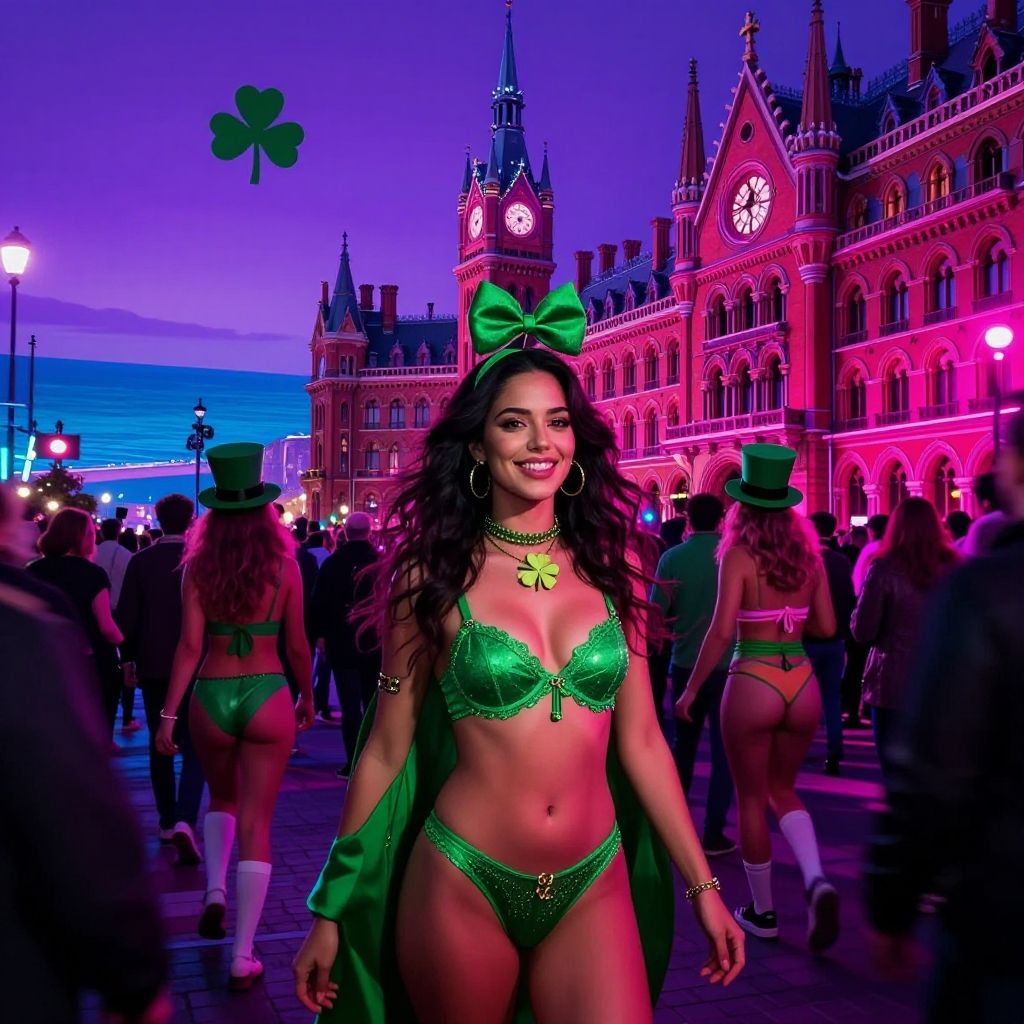 Photograph of a vibrant night scene featuring a confident woman with long, wavy dark hair, wearing a green sequined bra and thong set, adorned with a green bow on her head and a matching shamrock necklace. She has large hoop earrings and a green cape draped over her shoulders. The background showcases a Gothic-style building with illuminated clock towers, pink and purple neon lights, and a blurred crowd of people. A green shamrock floats in the purple sky. The overall atmosphere is festive and colorful, with a mix of natural and artificial lighting.