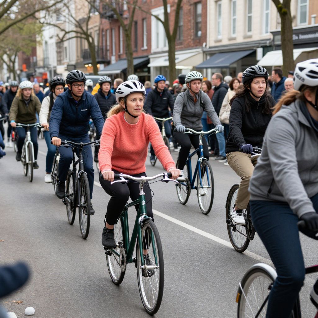 Photograph of a group of cyclists riding on a city street during a bike event. In the foreground, a young woman with light skin, long brown hair, wearing a white helmet, orange sweater, and black pants, rides a green bicycle. To her right, a woman with light skin, brown hair, and sunglasses in a black and white outfit rides a black bicycle. In the background, several cyclists, including men and women of diverse ages and ethnicities, wear helmets and casual attire. The street is lined with buildings and trees, and spectators sit on the sidewalk. The image is vibrant with a mix of bright and muted colors.
