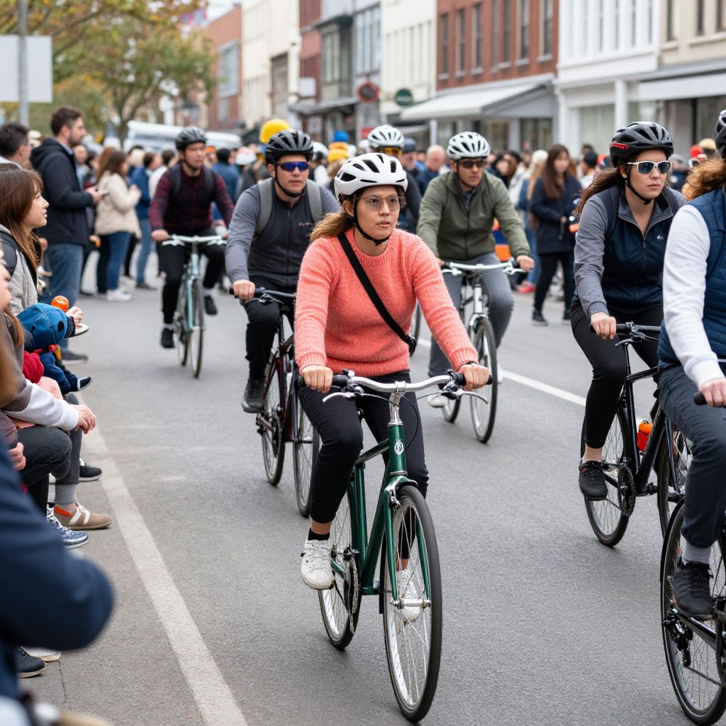Cyclists navigate a busy urban street during the Bicycle Music Festival VII, with a woman in a coral sweater leading the pack on a green bicycle, surrounded by a crowd of spectators and fellow riders.
