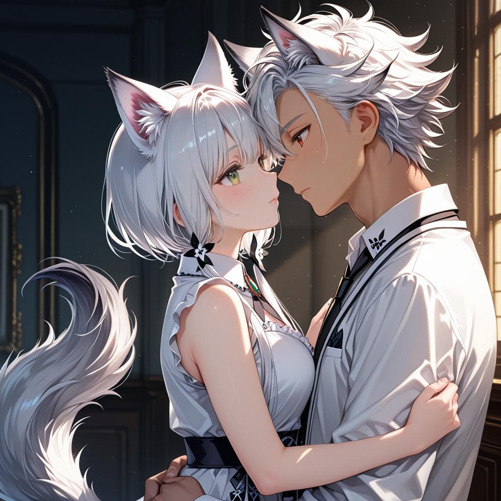 Jack howl, twisted wonderland, 1boy, wolf boy, dark-skinned male, wolf ears, wolf tail, animal ear fluff, yellow eyes, short hair, white hair, by artist kimishima ao, dark_illustrious