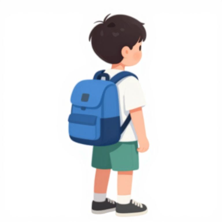 An illustration of an Asian boy, standing with his back to the viewer, wearing a white shirt, green shorts, and a blue backpack, against a white background.
