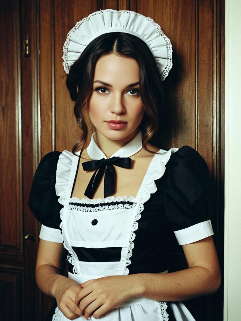 Photorealistic portrait of a young woman wearing a traditional black and white maid costume including puffed sleeves, lace-trimmed apron, gloves, and a ruffled headpiece. She has a fair complexion, dark hair styled elegantly, and is wearing red lipstick. The background shows a wooden door, suggesting an indoor setting.