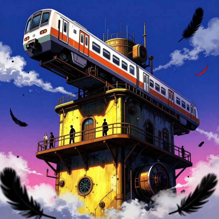 Anime, cyberpunk, View from below, extremely tall huge cyber train, two story, balcony, small silhouettes, vivid, high contrast, very colorful bright, the shapes of picture are very squared and sharp, feathers flying, different futuristic people getting ready to depart by this train, ginormous train, steampunk, a lot of steam and smoke coming fills the whole picture, great shadows, beautiful night sky